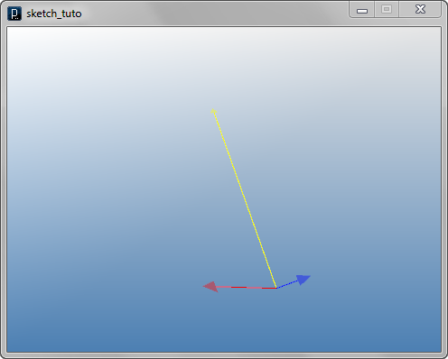 import processing.opengl.*; import igeo.*; size( 480, 360, IG.GL ); IVec v1 = new IVec(10, 10, 10); IVec axis = new IVec(0, 0, 10); IVec v2 = v1.dup(); v2.rot(axis, PI/2); IVec center = new IVec(10,0,0); IVec v3 = v1.dup(); v3.rot(center, axis, -PI/2); v1.show().clr(1.,0,0); axis.show().clr(0,0,1.); v2.show().clr(1.,1.,0); IPoint centerPt = new IPoint(center); axis.show(center).clr(0,0,1.); v3.show().clr(1.,.5,0);