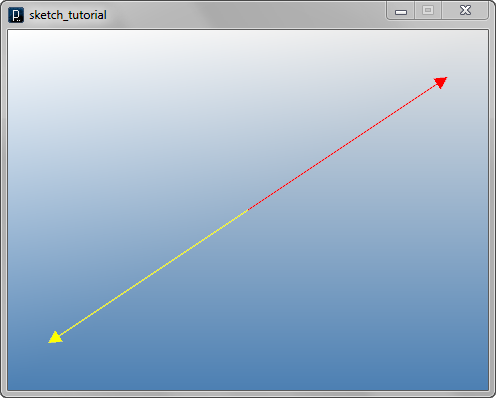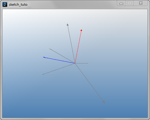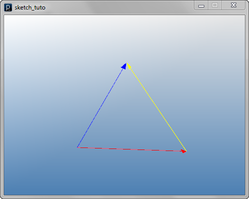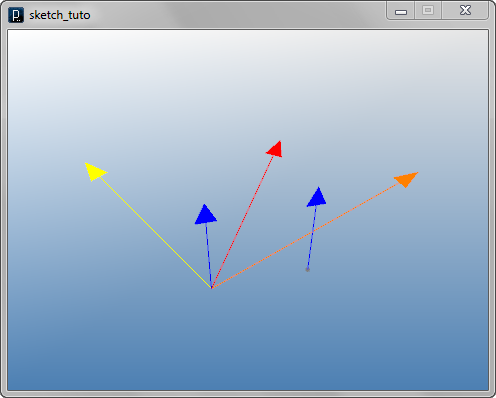 import processing.opengl.*; import igeo.*; size( 480, 360, IG.GL ); IVec v1 = new IVec(30,-20,-10); IVec v2 = new IVec(20,0,20); IVec v3 = v2.dif(v1); v1.show().clr(1.,0,0); v2.show().clr(0,0,1.); v3.show(v1).clr(1.,1.,0);