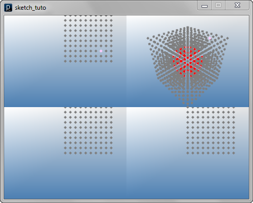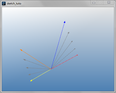 import processing.opengl.*; import igeo.*; size( 480, 360, IG.GL ); IVec v1 = new IVec(50,0,-10); IVec v2 = new IVec(30,10,40); IVec u1 = v1.sum(v2, 0.75, 0.25); IVec u2 = v1.sum(v2, 0.5, 0.5); IVec u3 = v1.sum(v2, 0.25, 0.75); IVec v3 = new IVec(-20,10,-10); IVec v4 = new IVec(-20,10,30); IVec u4 = v3.sum(v4, 0.25); IVec u5 = v3.sum(v4, 0.5); IVec u6 = v3.sum(v4, 0.75); v1.show().clr(1.,0,0); v2.show().clr(0,0,1.); v3.show().clr(1.,1.,0); v4.show().clr(1.,.5,0); u1.show(); u2.show(); u3.show(); u4.show(); u5.show(); u6.show();