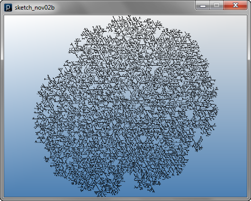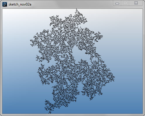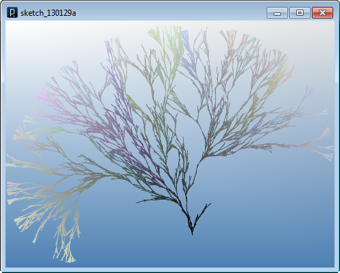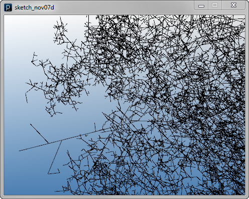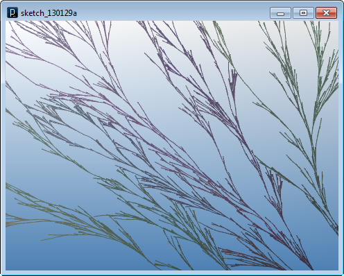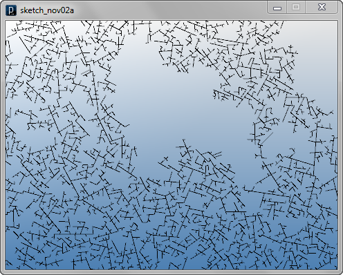 Interact Method Example 2Please note that the range of random angle of branching is from PI/3 to PI/3*2 because if the angle is less than PI/3, the end point would collide with straight member. Or if the angle is more than PI/3*2, it would collide with the parent line when you have LineAgent.length and LineAgent.clearance close. LineAgent.clearance cannot be larger than LineAgent.length because an agent would judge that the line always collides with the parent line.