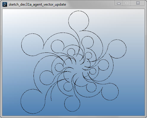 The next code has the same transformation of addition as the previous code but the initial direction vector is different. The initial direction is (2, -4, 0), instead of (1, 0, 0). An initial condition is also important factor to define the behavior of agents as well as an update transformation rule.