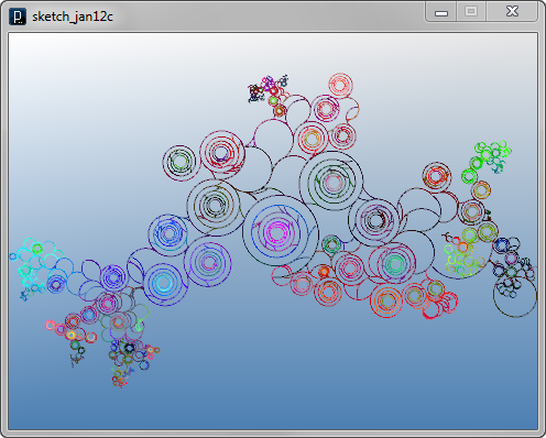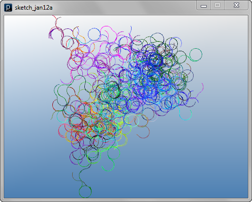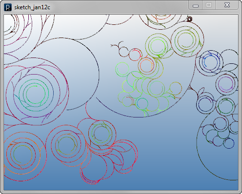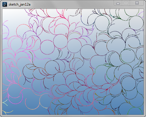 The next code adds interact() method to the previous code to detect collision of line agents. A line agent stops when it collides into other existing agents. Then the algorithm to swap left and right probability is also changed to swap them only when an agent creates a new branch.