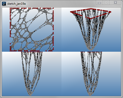Tensile Line NetworkThe code sets friction of particle agents to converge into one state, without oscillating. This is done by a particle agent's method fric(). Some value between 0.0 and 1.0 should be set in the friction method and 0.0 means no friction and 1.0 means full friction making the particle hardly move. Usually, very small number like 0.01 or 0.001 is enough to converge a movement behavior of particles. To fix the corners of the grid, the method of particle agent fix() is used. When a particle is fixed with this method, all the forces applied to it is ignored and it doesn't move. If you want to unfix once fixed particle, please use unfix() method.