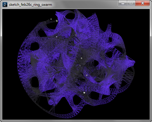 Swarm Example 2 (requires iGeo version 7.6.0 or higher)The first code below describes a swarm agent class MyBoid and this agent draws profile polygon lines around the agent's position instead of drawing trace lines behind. The number of vertices of the polygon lines is defined by the variable of pointNum in MyBoid class. Each vertex of the polygon is calculated by rotating points around the velocity vector of the agent.