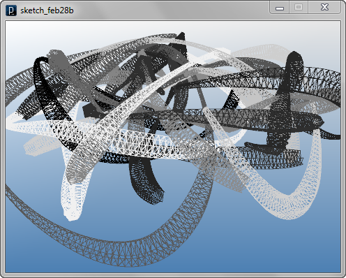 The code below combines the algorithm to create polygon truss geometries and the another algorithm to interconnect trajectories of swarm agents. The connection line of trajectories are drawn from the vertices of the truss geometries and the line is drawn as a closed polygon mesh geometry by the method IG.meshSquareStick(pt1, pt2, size).