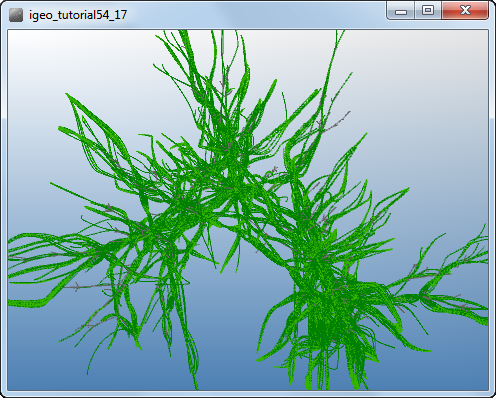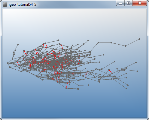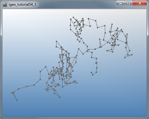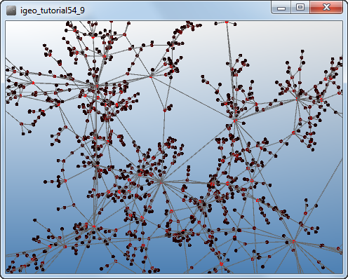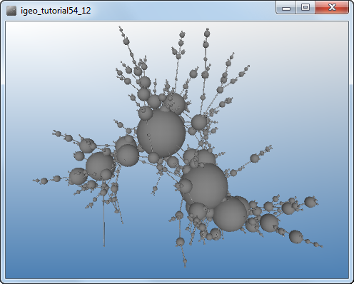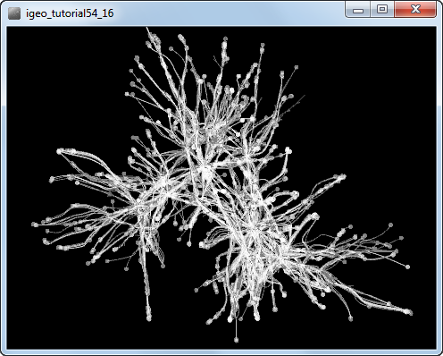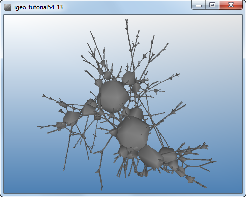 The next code generates the same network topology in a tree structure but the geometrical layout is controlled by orienting the direction to put a child agent towards the specified vector (1,0,0) (x-axis). The direction is calculated by the method IRand.dir(orientation, length, angle_range) and this method returns a vector towards a random direction within the angle range from the specified orientation and the vector length is also specified. As a result, it generates branches towards x-axis direction.