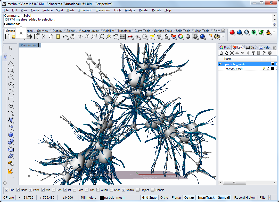 In setup() method, two instances of NodeAgent are created with different starting locations and opposite direction for the input of dir. When two networks grow out of two different parents towards opposite direction, two networks are interconnected by the algorithm defined in interact method.