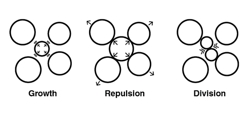 Cell Division and Growth by Particle and RepulsionThe tutorial codes in this page explore formation made by the mechanism inspired by cell division and growth process.