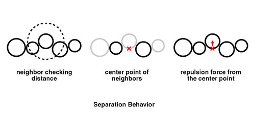 The code below also adds another behavior in interact method. It's a type of repulsion behavior which is same with the separation behavior in Boid algorithm. The behavior lets the cell to move away from the center of neighbors.