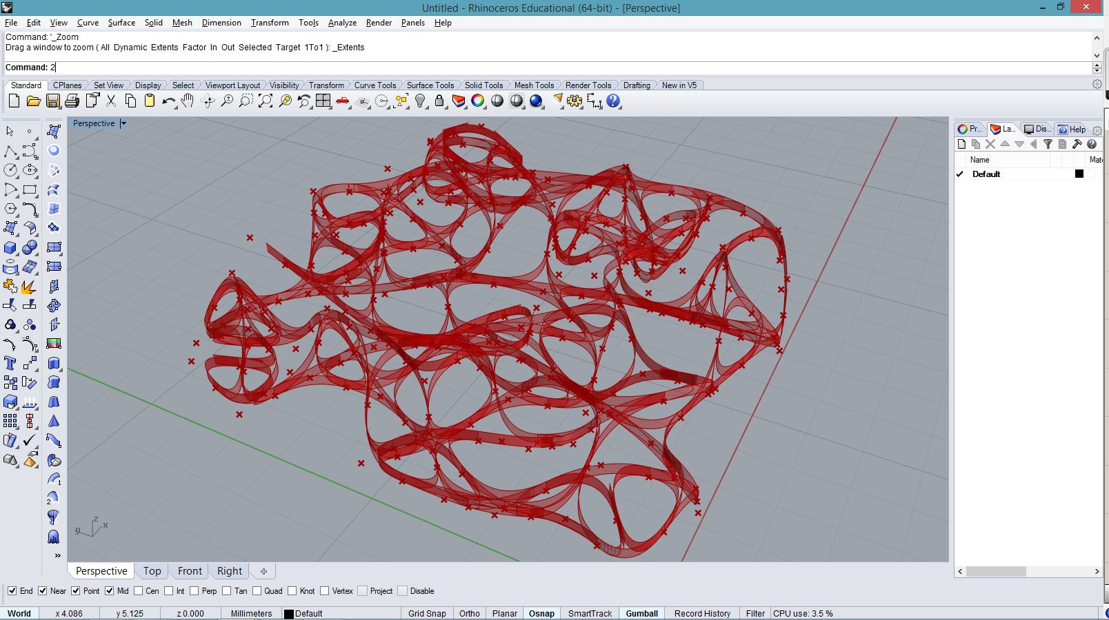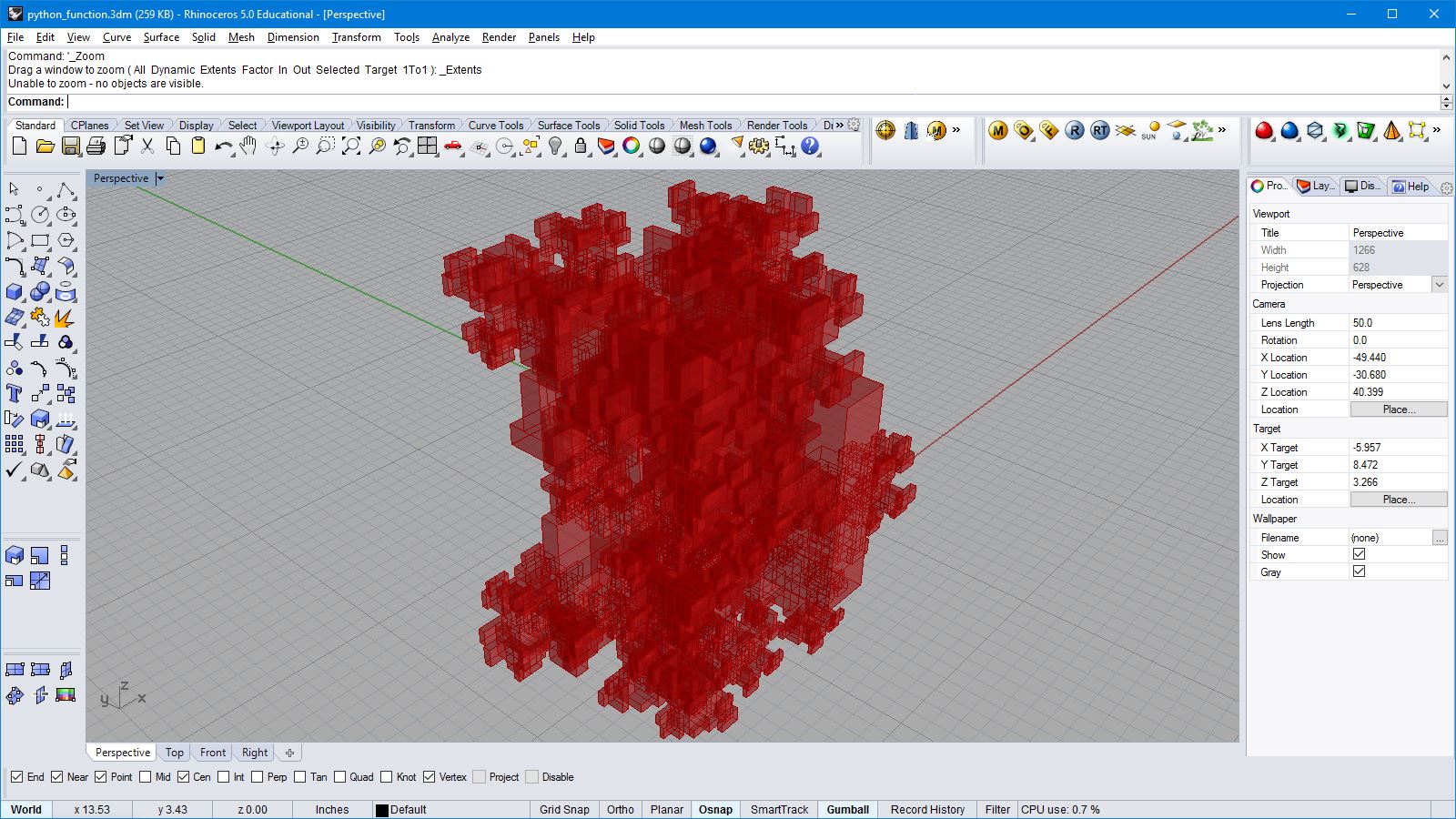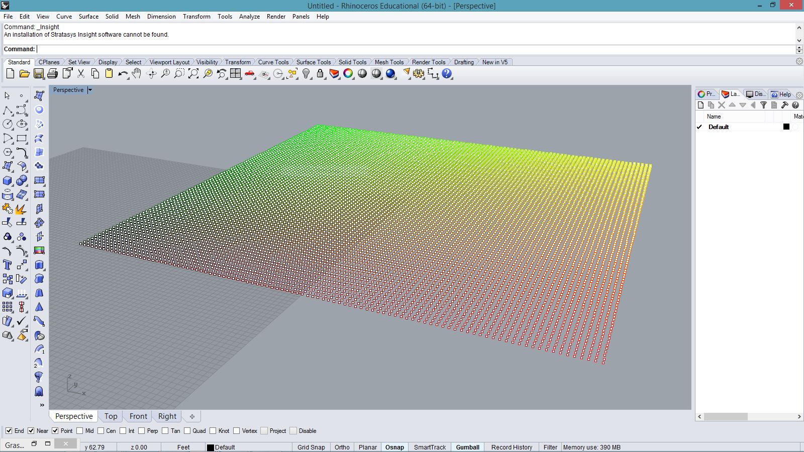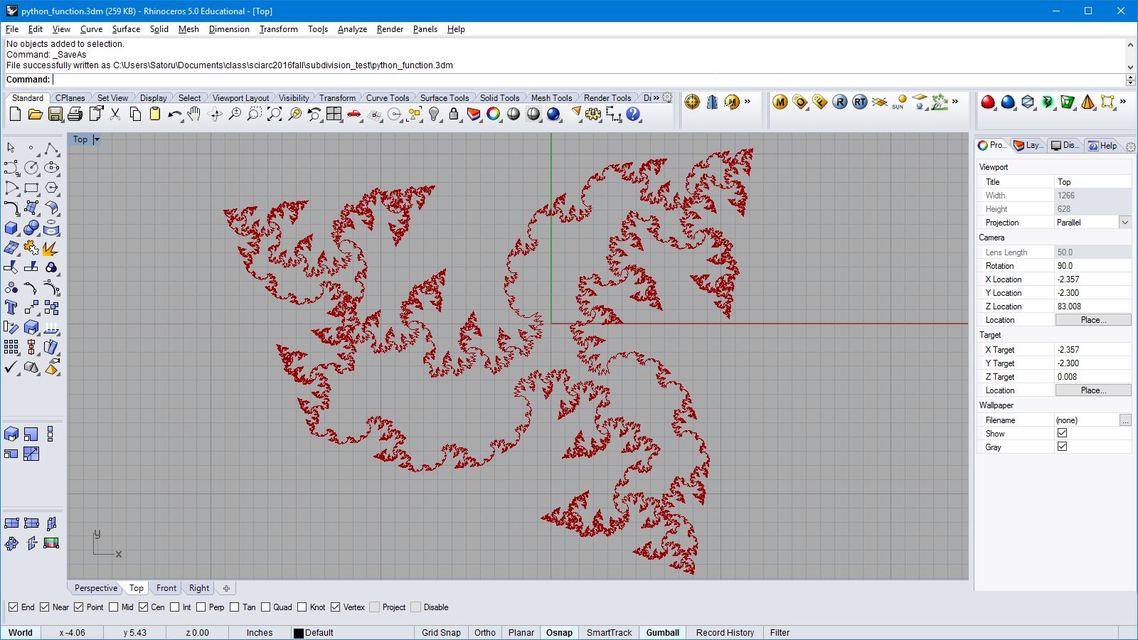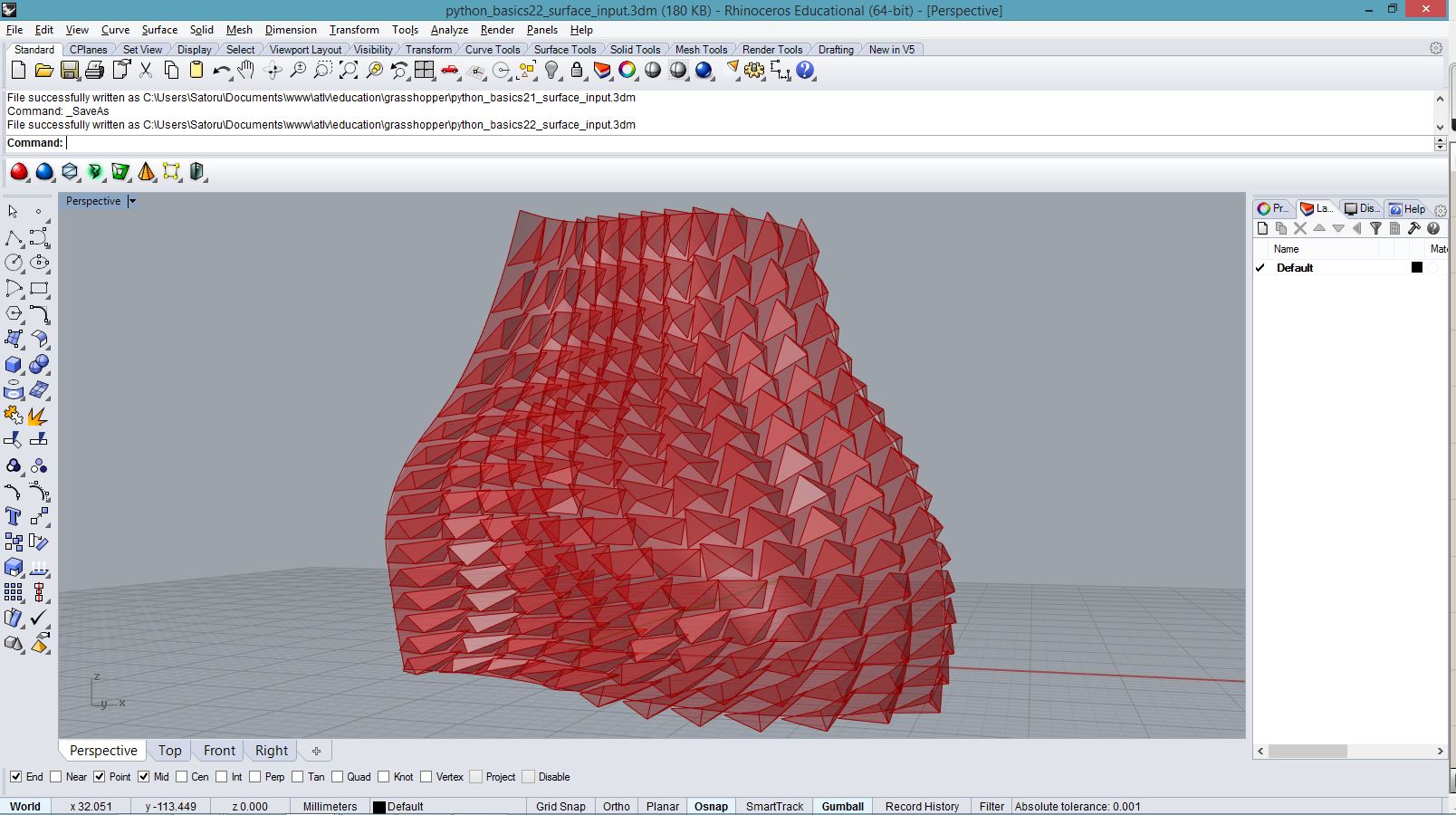 import rhinoscriptsyntax as rs import math a = [] for i in range(100): for j in range(100): x = i*0.5 y = j*0.5 if( i<20 and j<20 ): z = 2 elif( i>=20 and i<40 and j>=60 and j<80): z = 1 elif( i==50 or j==50): z = 2 elif( i>=60 and i<80 and j>=20 and j<80): z = math.cos(j*0.2)+2 elif( not i>60 and j>=25 and j<35): z = 8 - i*0.1 elif( not (i<90 and j<90) ): z = math.sin(i*0.2) * math.cos(j*0.2)+2 else: z = math.cos(i*0.1) * math.sin(j*0.1) p = rs.AddPoint(x,y,z) a.append(p)