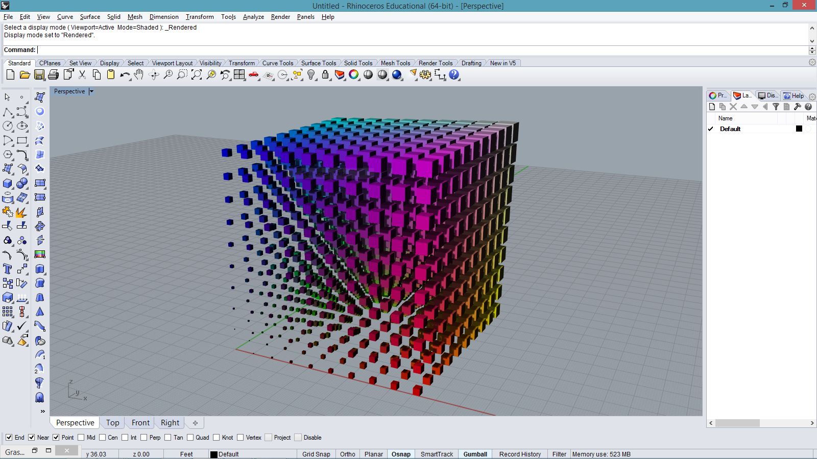 # bake breps with simple materials # input type - bool (Item Access) import scriptcontext as sc import System.Drawing as sd import Rhino.DocObjects as rd import Rhino.Geometry as rg import Rhino sc.doc = Rhino.RhinoDoc.ActiveDoc if bake: xnum = 10 ynum = 10 znum = 10 for i in range(xnum): for j in range(ynum): for k in range(znum): size = (i/xnum+j/ynum+k/znum)/3 box = rg.Box( rg.Plane.WorldXY, rg.Interval(i, i+size), rg.Interval(j,j+size), rg.Interval(k, k+size) ) brep = rg.Brep.CreateFromBox(box) materialIndex = sc.doc.Materials.Add() material = sc.doc.Materials[materialIndex] material.DiffuseColor = sd.Color.FromArgb(i/xnum*255, j/ynum*255, k/znum*255) material.CommitChanges() attr = rd.ObjectAttributes() attr.MaterialSource = rd.ObjectMaterialSource.MaterialFromObject attr.MaterialIndex = materialIndex sc.doc.Objects.AddBrep(brep, attr)