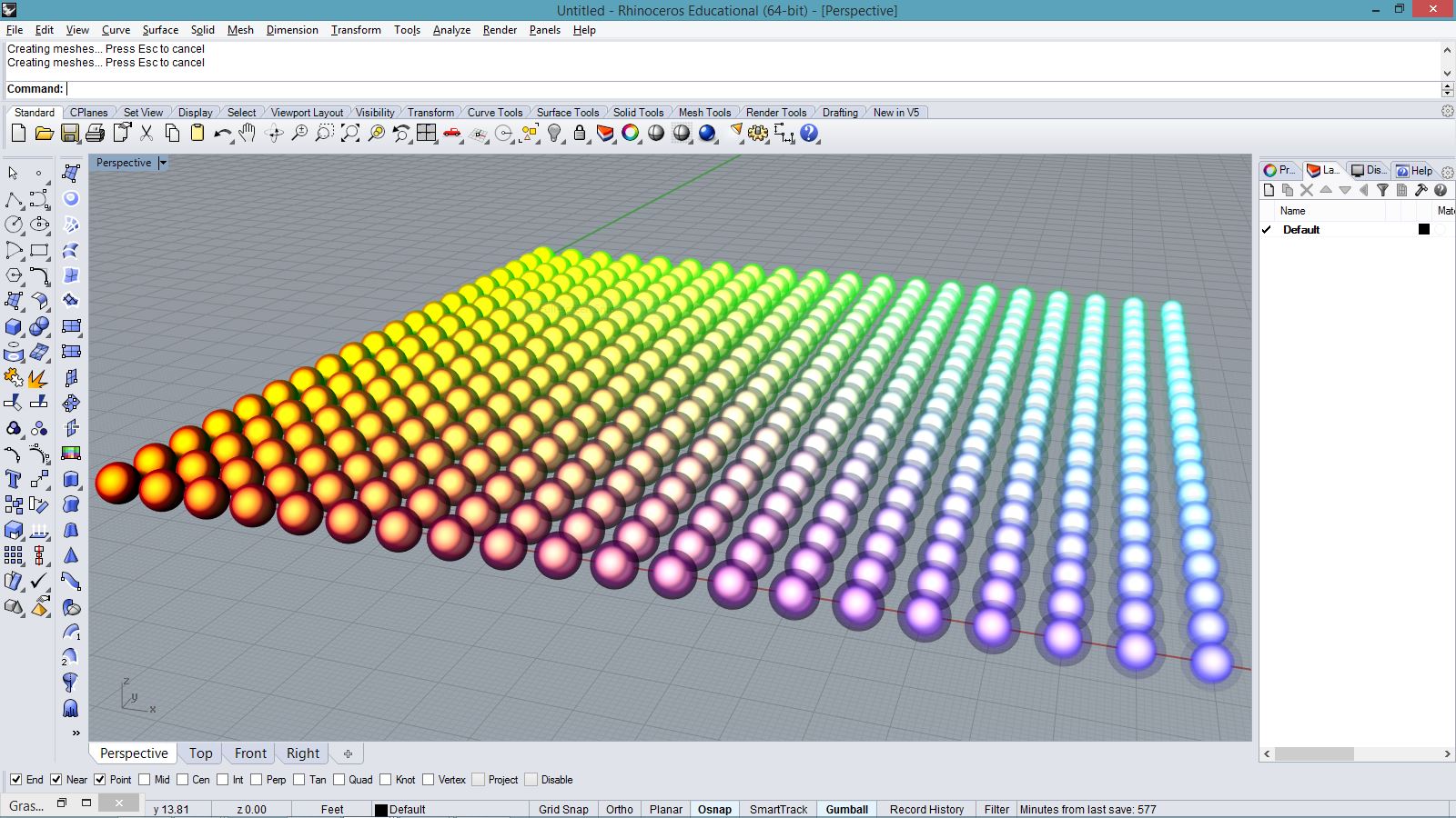 # material attributes # input type - bool (Item Access) import scriptcontext as sc import System.Drawing as sd import Rhino.DocObjects as rd import Rhino.Geometry as rg import Rhino sc.doc = Rhino.RhinoDoc.ActiveDoc if bake: xnum = 20 ynum = 20 for i in range(xnum): for j in range(ynum): pt = rg.Point3d(i, j, 0) sphere = rg.Sphere(pt, 0.4) surface = rg.NurbsSurface.CreateFromSphere(sphere) materialIndex = sc.doc.Materials.Add() material = sc.doc.Materials[materialIndex] material.AmbientColor = sd.Color.FromArgb(0, 0, 0) material.DiffuseColor = sd.Color.FromArgb(255, 0, 0) material.EmissionColor = sd.Color.FromArgb(0, j/ynum*255, 0) material.ReflectionColor = sd.Color.FromArgb(255, 255, 255) material.SpecularColor = sd.Color.FromArgb(255, 255, i/xnum*255) material.Transparency = i/xnum material.TransparentColor = sd.Color.FromArgb(0, 0, 255) material.Shine = 1 material.CommitChanges() attr = rd.ObjectAttributes() attr.MaterialSource = rd.ObjectMaterialSource.MaterialFromObject attr.MaterialIndex = materialIndex sc.doc.Objects.AddSurface(surface, attr)