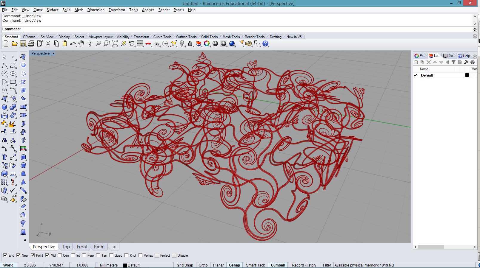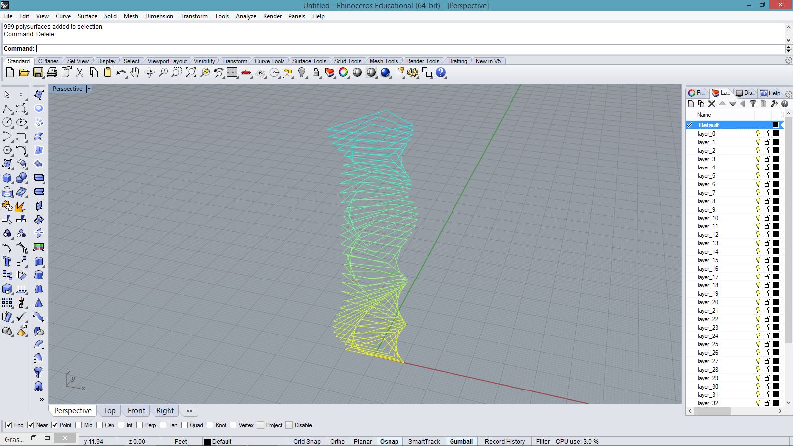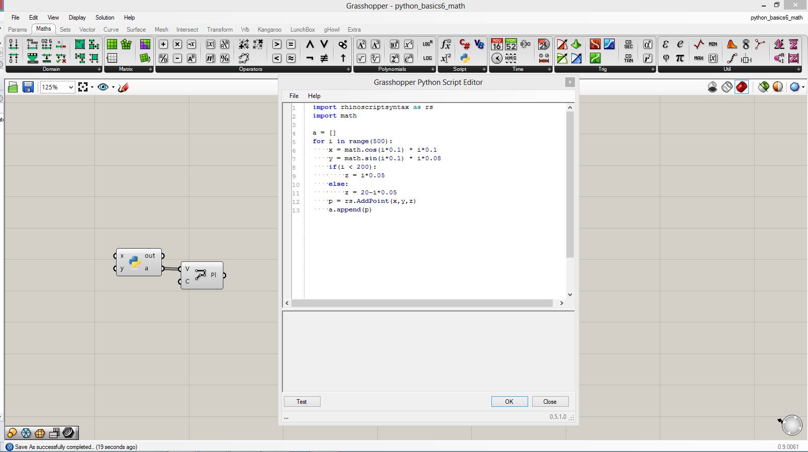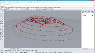 import rhinoscriptsyntax as rs import math a = [] for i in range(500): x = math.cos(i*0.1) * i*0.1 y = math.sin(i*0.1) * i*0.08 if(i < 200): z = i*0.05 else: z = 20-i*0.05 p = rs.AddPoint(x,y,z) a.append(p)