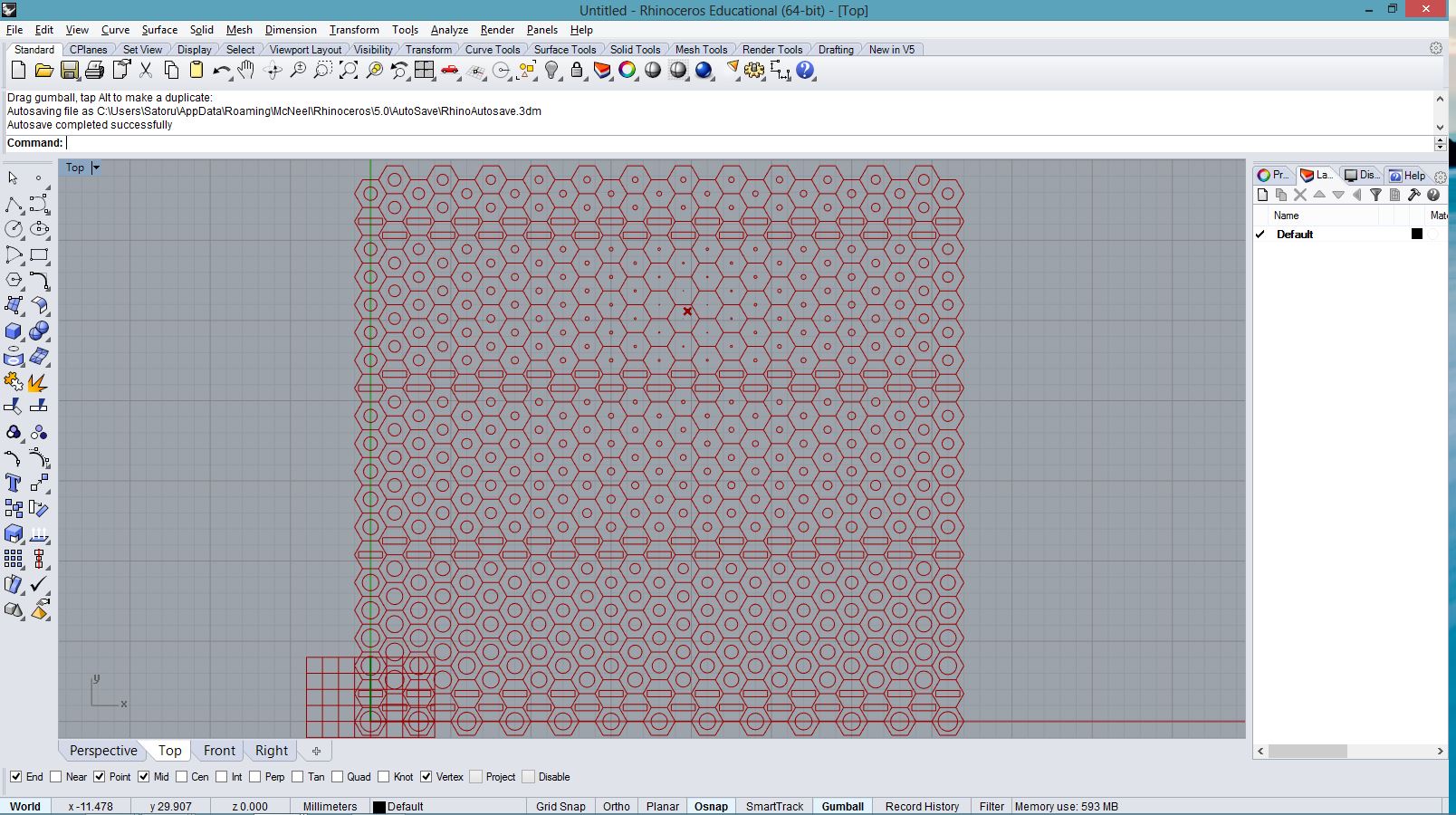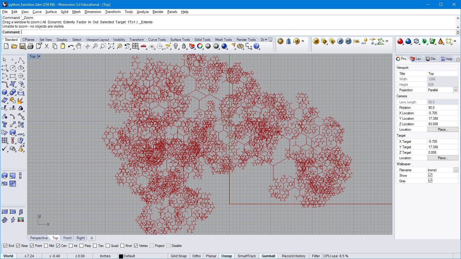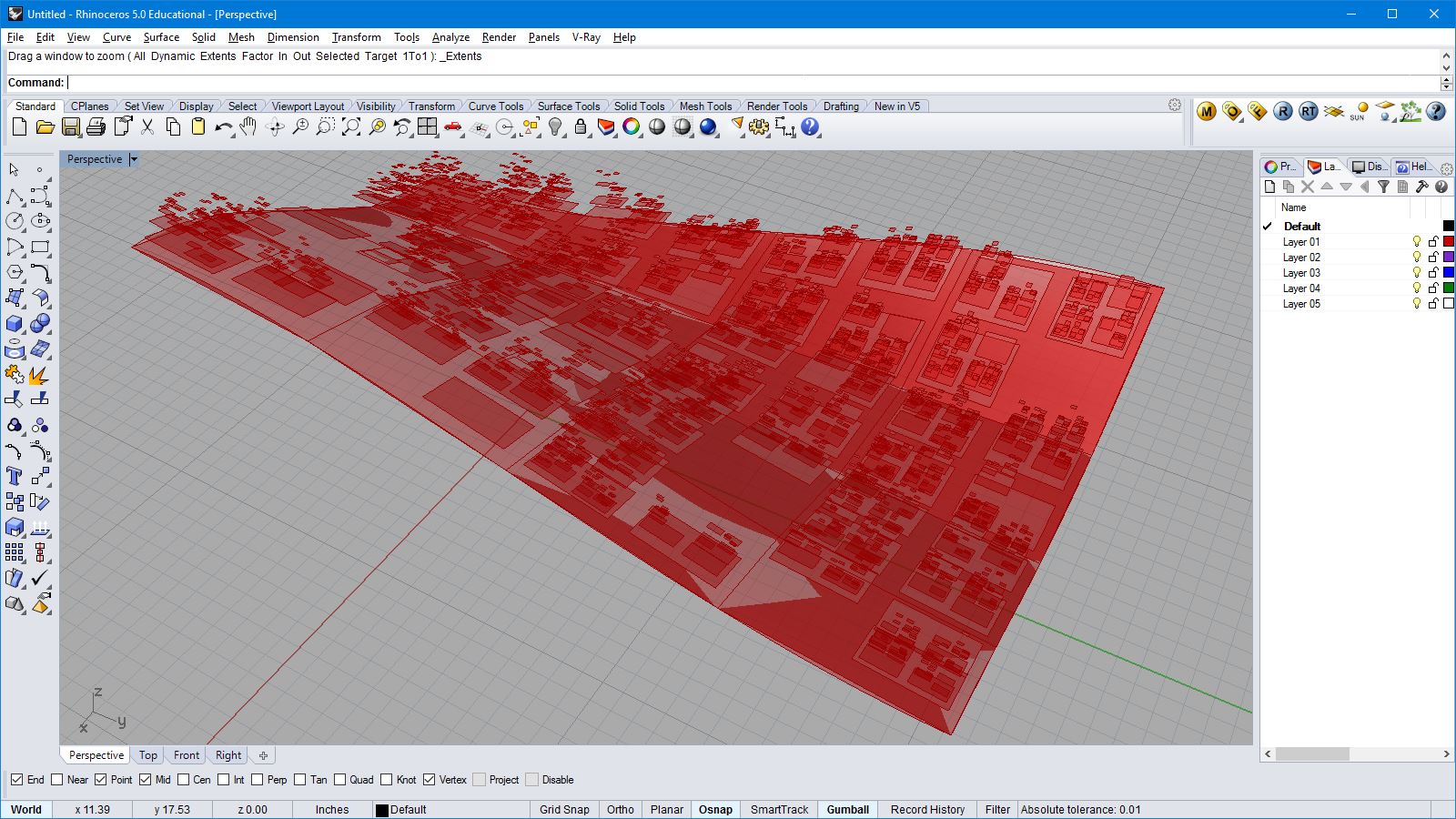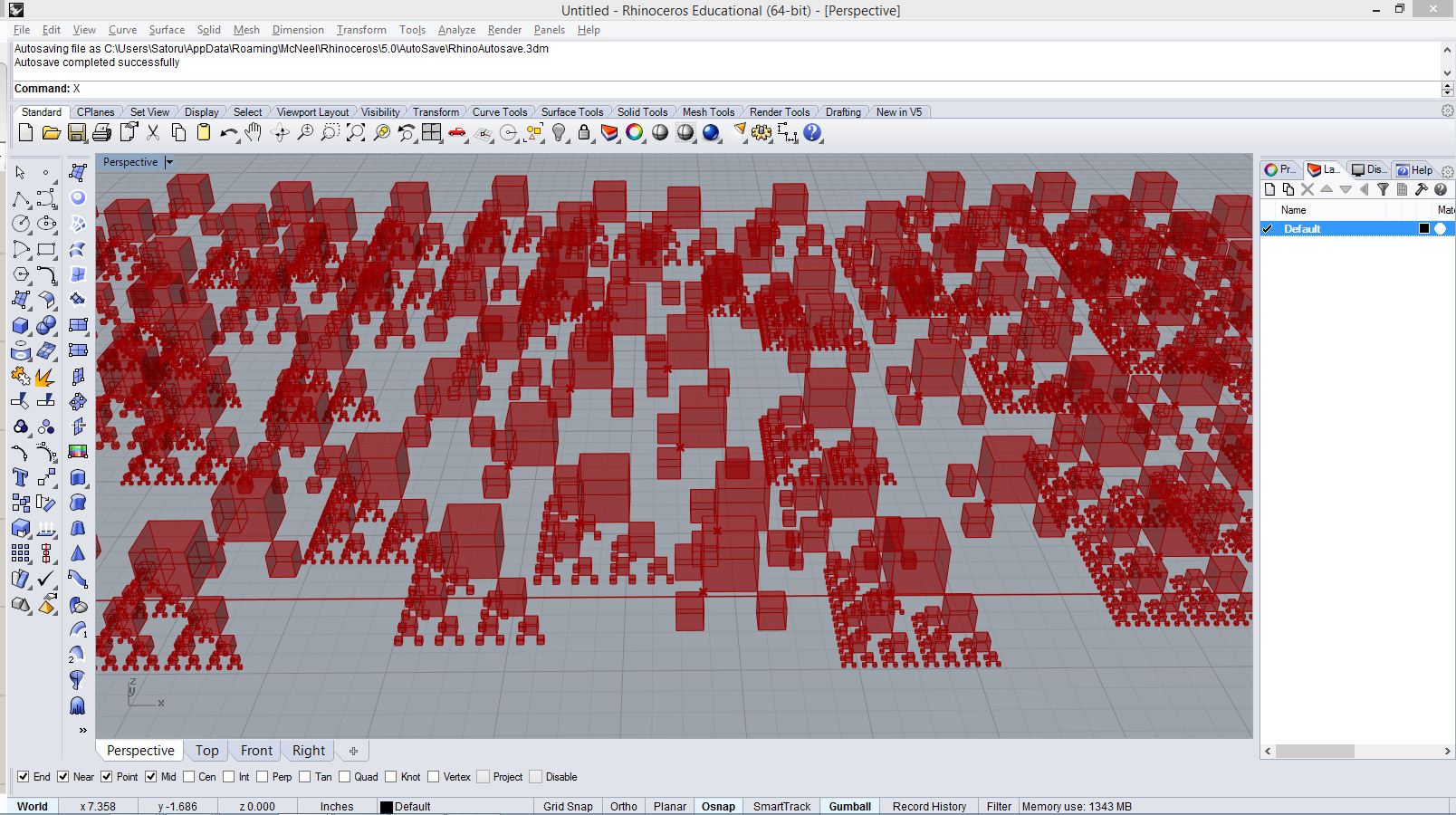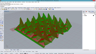 import rhinoscriptsyntax as rs import math a = [] for i in range(100): for j in range(100): x = i*0.5 y = j*0.5 if( i%20<4 or j%20<4 ): z = 0 elif( i%20+j%20 > 20): z = ((20 - i%20) * (j%20))*0.03 z += math.cos(i*0.1) * math.sin(j*0.1)*2+2 elif( i%20>=5 and j%20<10 ): z = ((i%20)*(i%20)/20 + (j%20)/2)*0.3 else: z = ((i%20)*0.2 + (j%20)*0.3) p = rs.AddPoint(x,y,z) a.append(p)