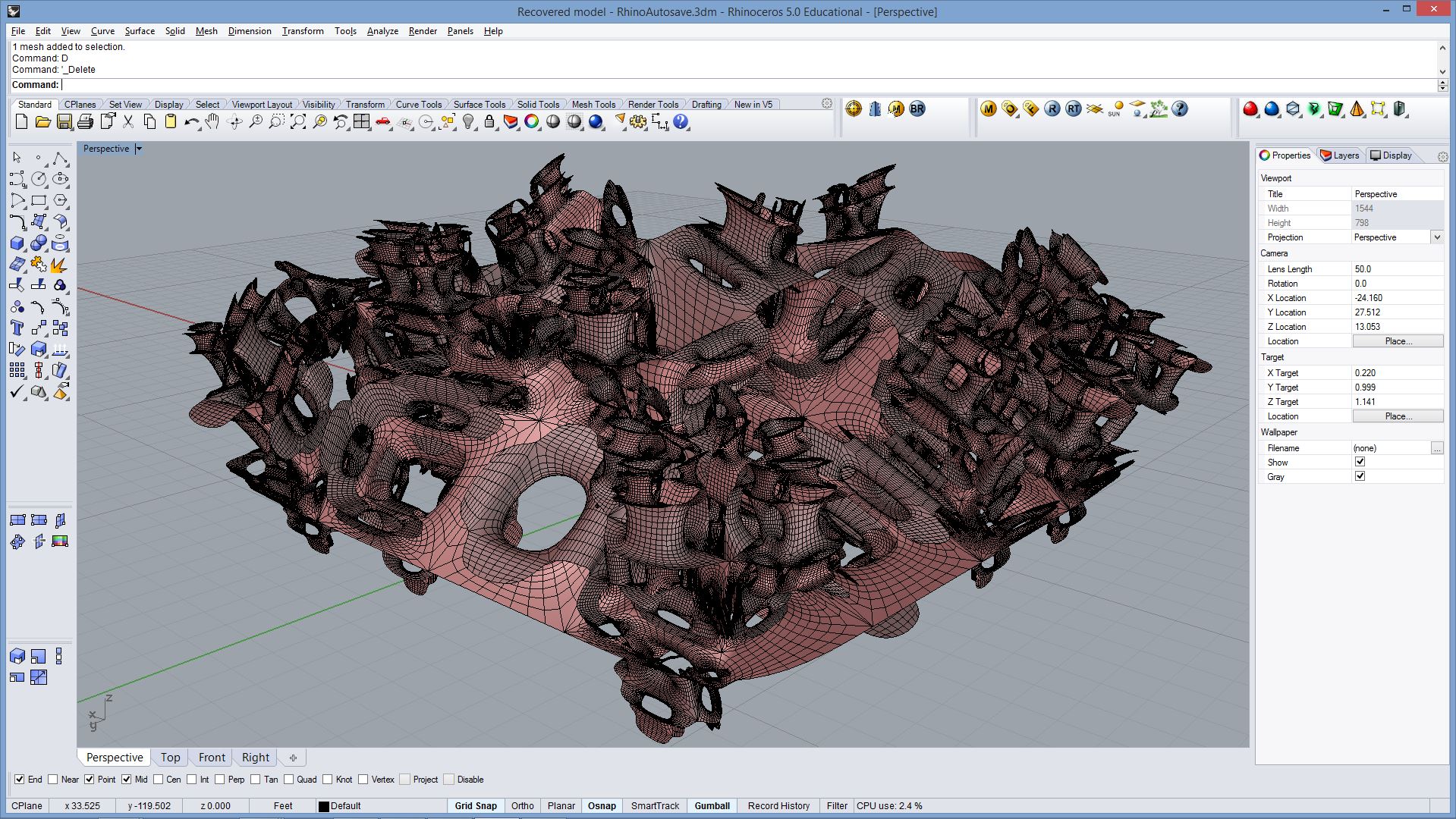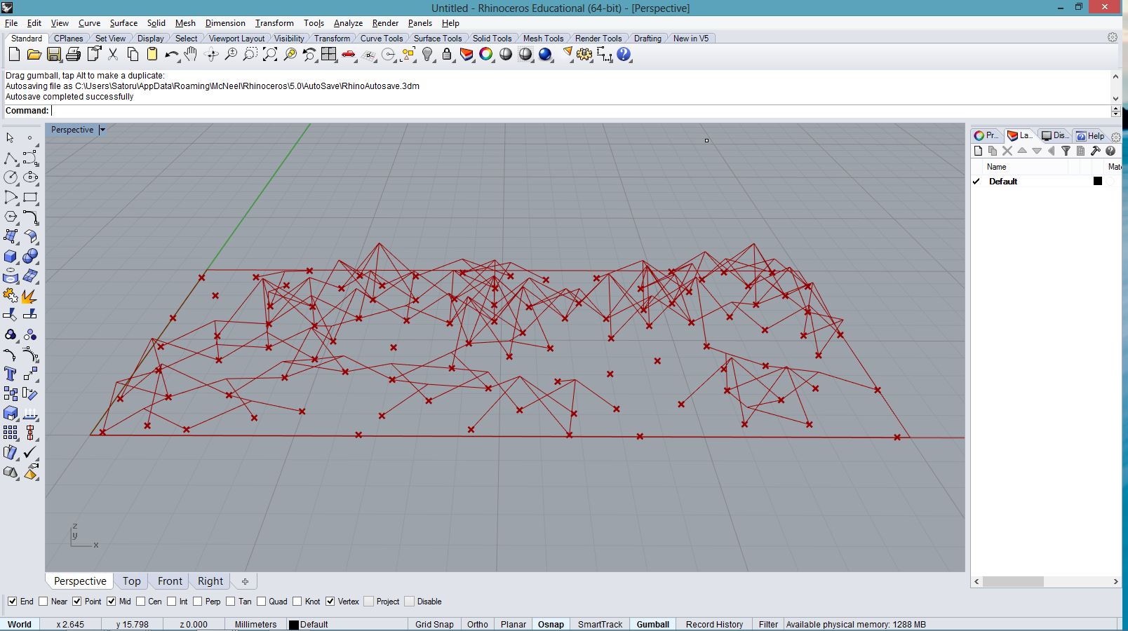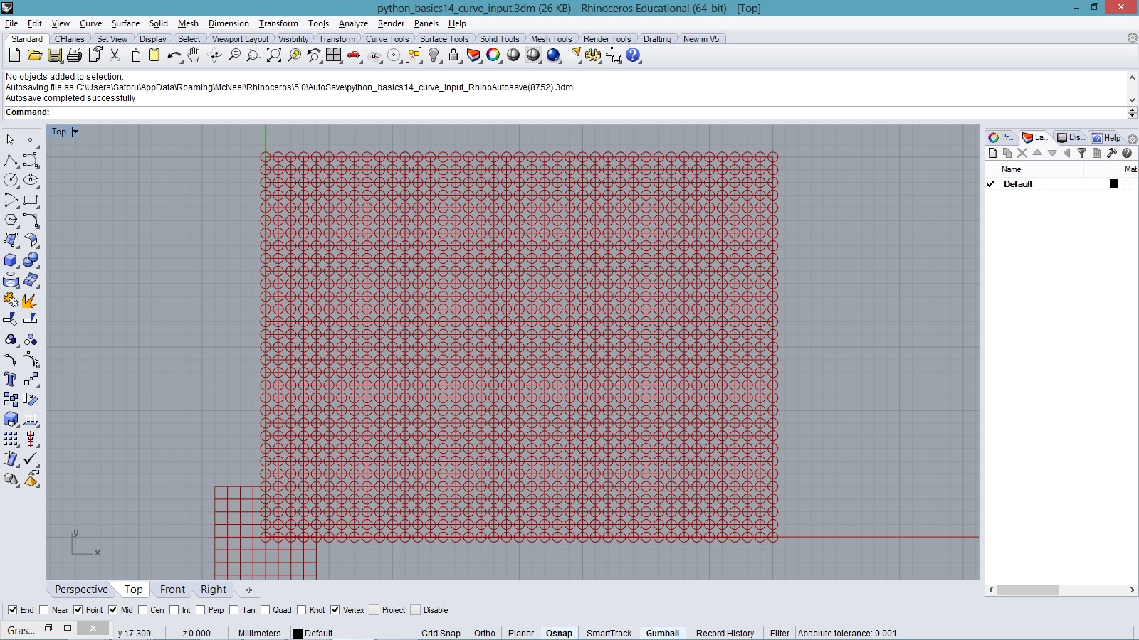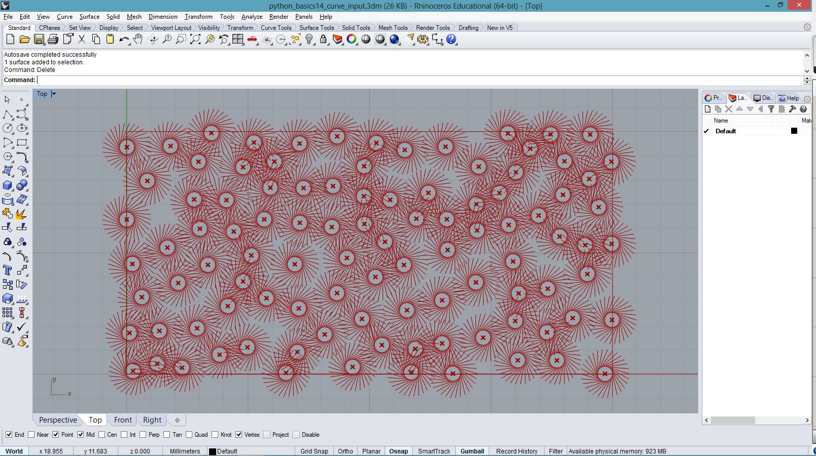 import rhinoscriptsyntax as rs import math a = [] for i in range(100): for j in range(50): x = i*0.5 y = j*0.5 z = math.sin(i*0.1)*1; if(j%20 < 10): z *= (j%20)*0.2; else: z *= (20 - j%20)*0.2; p = rs.AddPoint(x,y,z) a.append(p)