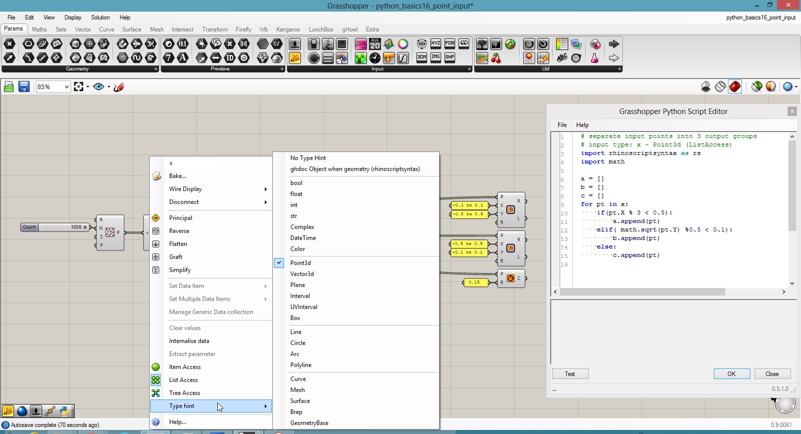 # separate input points into 3 output groups # input type - x : Point3d (ListAccess) import rhinoscriptsyntax as rs import math a = [] b = [] c = [] for pt in x: if(pt.X % 3 < 0.5): a.append(pt) elif( math.sqrt(pt.Y) %0.5 < 0.1): b.append(pt) else: c.append(pt)