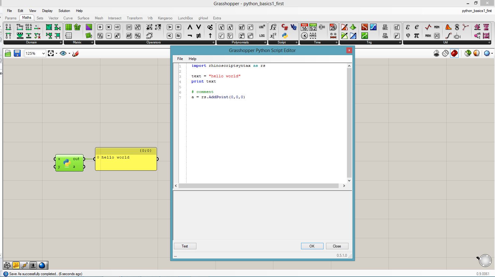 import rhinoscriptsyntax as rs text = "hello world" print text # comment a = rs.AddPoint(0,0,0)