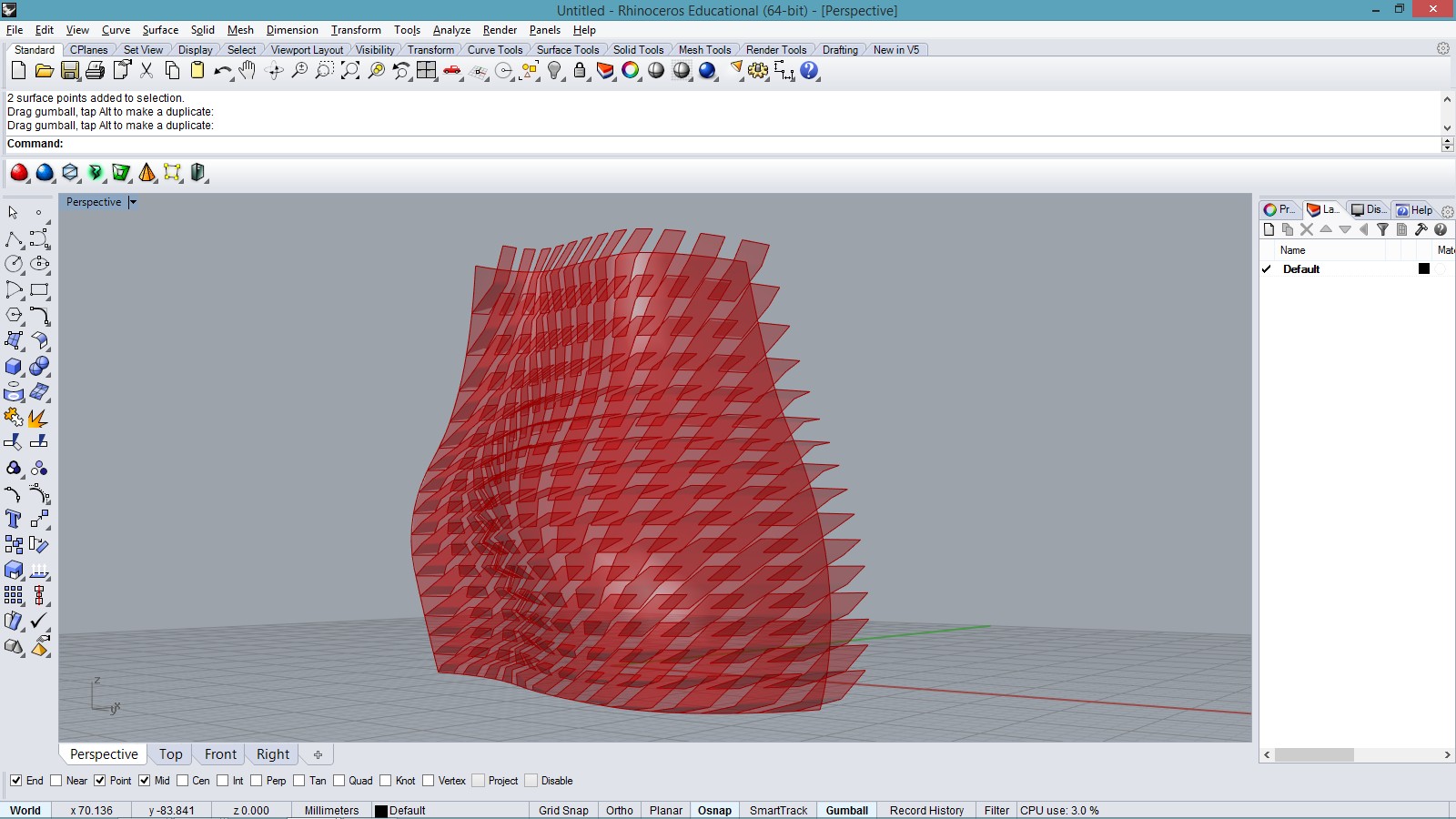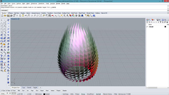 # This makes surface panels by 3 points on an input surface # input type: surf - Surface, unum - int, vnum - int # This makes surface panels by 3 points on an input surface # input type: surf - Surface, unum - int, vnum - int import scriptcontext as sc import System.Drawing as sd import Rhino.DocObjects as rd import Rhino.Geometry as rg import Rhino import math def stretchTriangle(pt1, pt2, pt3, nml, stretchRatio): pt4 = pt2 + (pt2-pt1)*stretchRatio + nml return rg.NurbsSurface.CreateFromPoints([pt1,pt2,pt4, pt3,pt2,pt4], 2, 3, 1, 2) sc.doc = Rhino.RhinoDoc.ActiveDoc panels = [] for i in range(unum): for j in range(vnum): if (i+j)%2 == 0: u = i/unum v = j/vnum pt1 = surf.PointAt(u, v) pt2 = surf.PointAt(u + 1/unum, v - 1/vnum) pt3 = surf.PointAt(u + 1/unum, v + 1/vnum) pt4 = surf.PointAt(u + 1/unum, v + 0.5/vnum) nml = surf.NormalAt(u, v) panel1 = stretchTriangle(pt1, pt2, pt3+nml*0.5, nml*2*u, 4*u+0.5) panels.append(panel1) panel2 = stretchTriangle(pt1, pt4, pt2, nml*u, 2*u+0.5) panels.append(panel2) if bake: materialIndex1 = sc.doc.Materials.Add() material1 = sc.doc.Materials[materialIndex1] if (i+j)%4 == 0: material1.DiffuseColor = sd.Color.FromArgb(255-u*255, u*255, math.fabs(1-2*v)*255) material1.EmissionColor = sd.Color.FromArgb(0, u*30, 0) material1.SpecularColor = sd.Color.FromArgb(u*255, 0, u*255) material1.Shine = 0.25 else: material1.DiffuseColor = sd.Color.FromArgb(0,0,128) material1.Transparency = 0.25 material1.CommitChanges() attr1 = rd.ObjectAttributes() attr1.MaterialSource = rd.ObjectMaterialSource.MaterialFromObject attr1.MaterialIndex = materialIndex1 sc.doc.Objects.AddSurface(panel1, attr1) materialIndex2 = sc.doc.Materials.Add() material2 = sc.doc.Materials[materialIndex2] material2.DiffuseColor = sd.Color.FromArgb(math.fabs(1-2*v)*255, (1-math.fabs(1-2*v))*128, 0) material2.CommitChanges() attr2 = rd.ObjectAttributes() attr2.MaterialSource = rd.ObjectMaterialSource.MaterialFromObject attr2.MaterialIndex = materialIndex2 sc.doc.Objects.AddSurface(panel2, attr2)