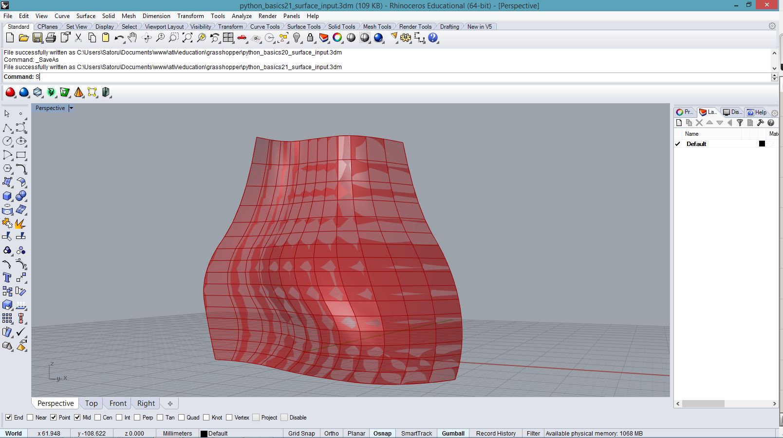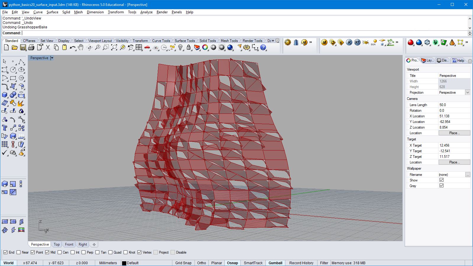 #building a point grid out of input parameters #input type - x : int, y : int, z : float, u : float import rhinoscriptsyntax as rs import math a = [] for i in range(x): for j in range(y): p = rs.AddPoint(i, j, math.sin(i*u) * math.sin(j*u) * z) a.append(p)