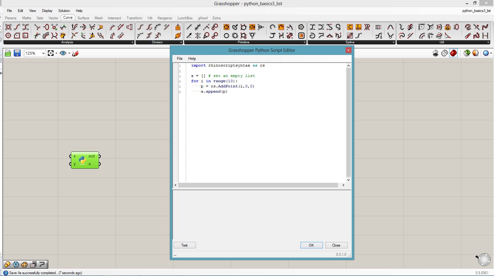 import rhinoscriptsyntax as rs a = [] # set an empty list for i in range(10): p = rs.AddPoint(i,0,0) a.append(p)