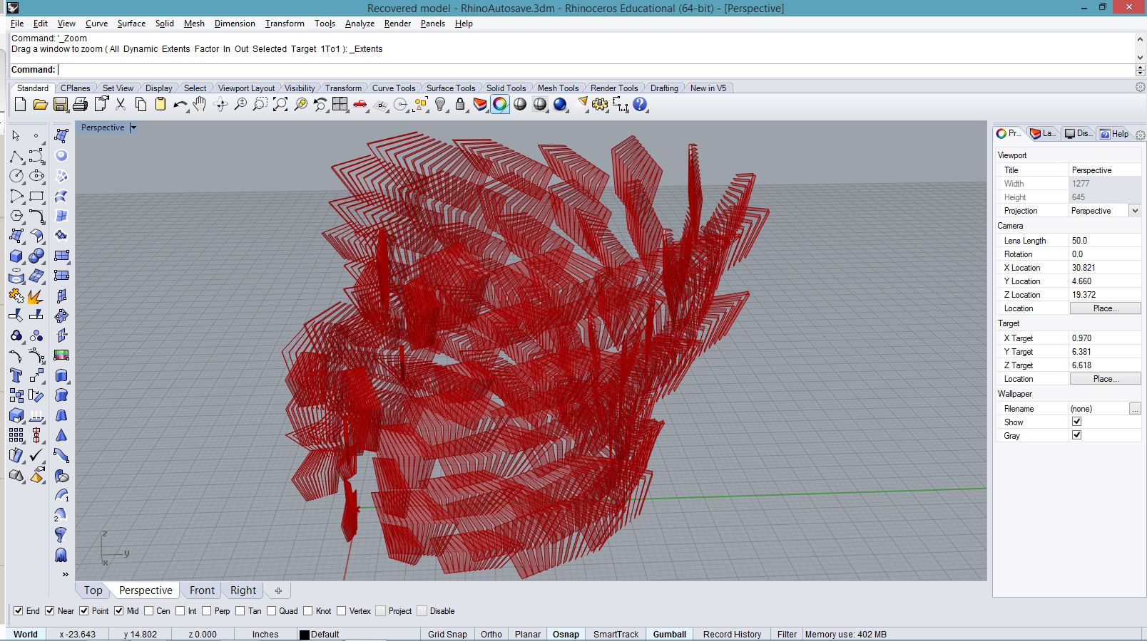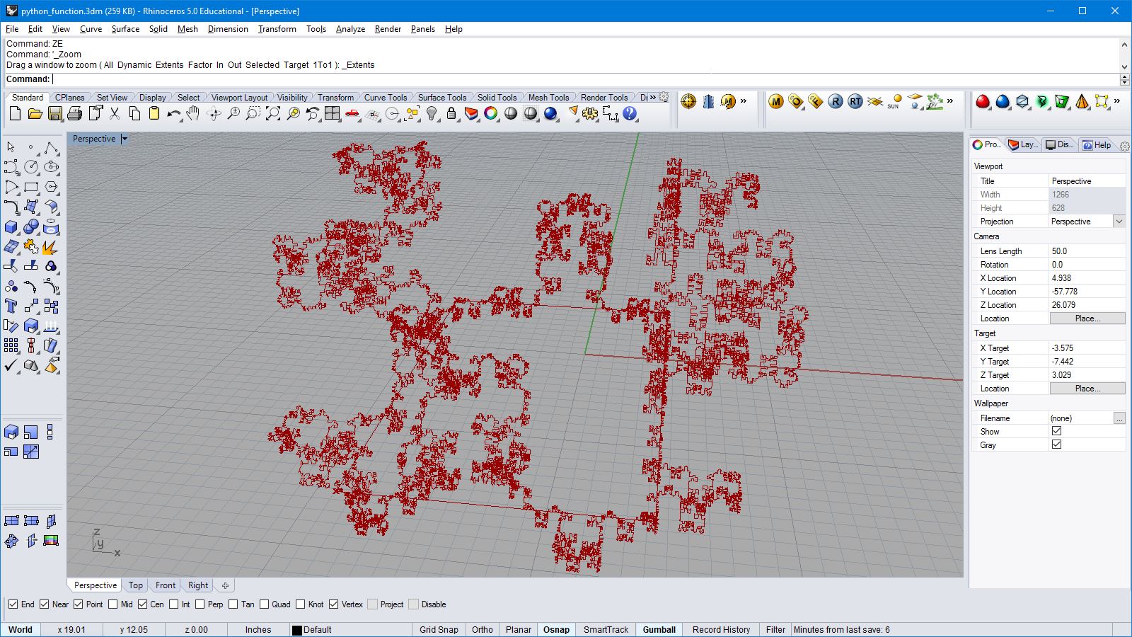 import rhinoscriptsyntax as rs import random import math a = [] for i in range(500): x = math.cos(i*0.2) * i*0.1 y = math.sin(i*0.2) * i*0.08 if(i<200): z = 0 else: z = random.random() * (i-200)* 0.02 p = rs.AddPoint(x,y,z) a.append(p)