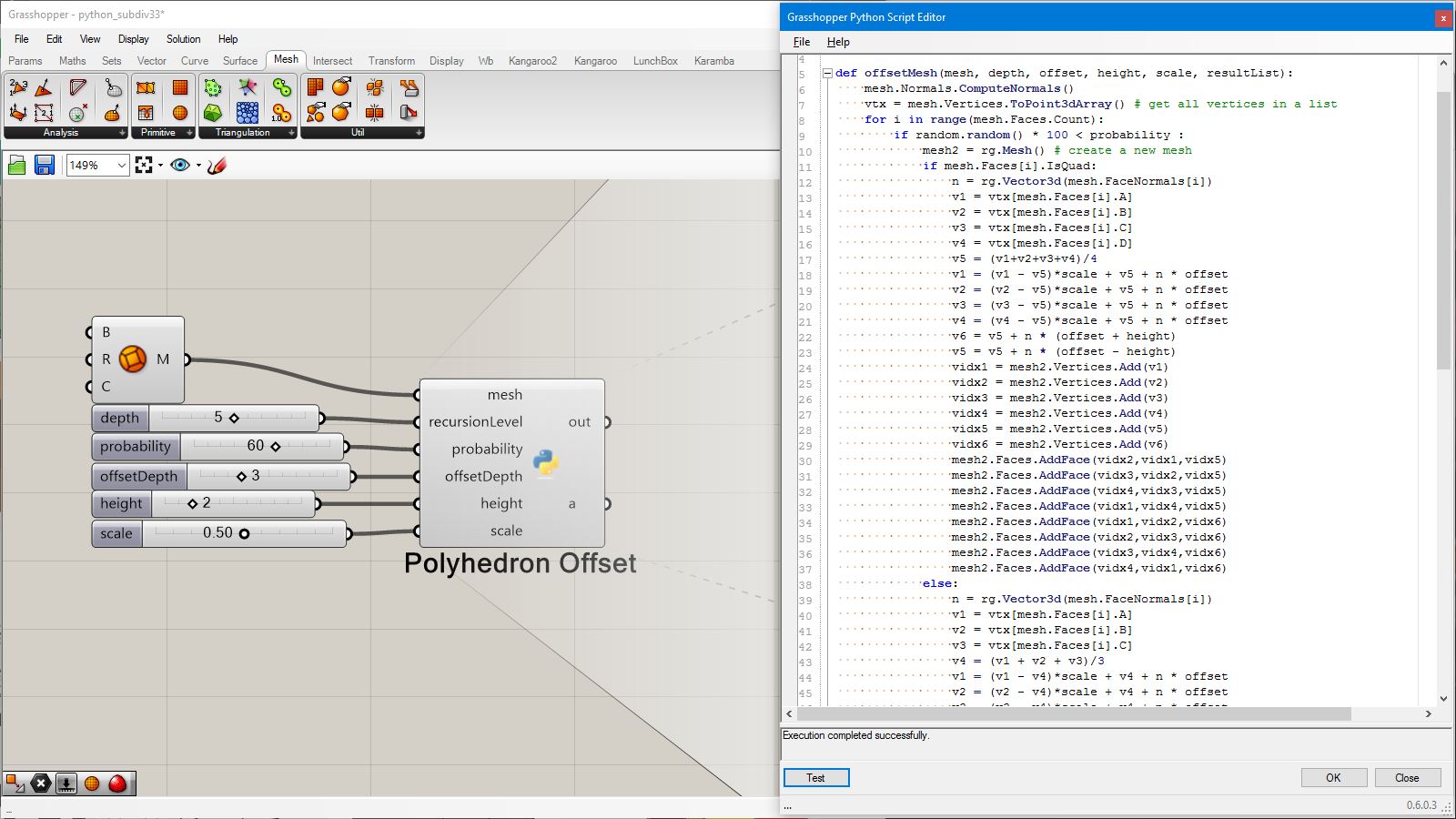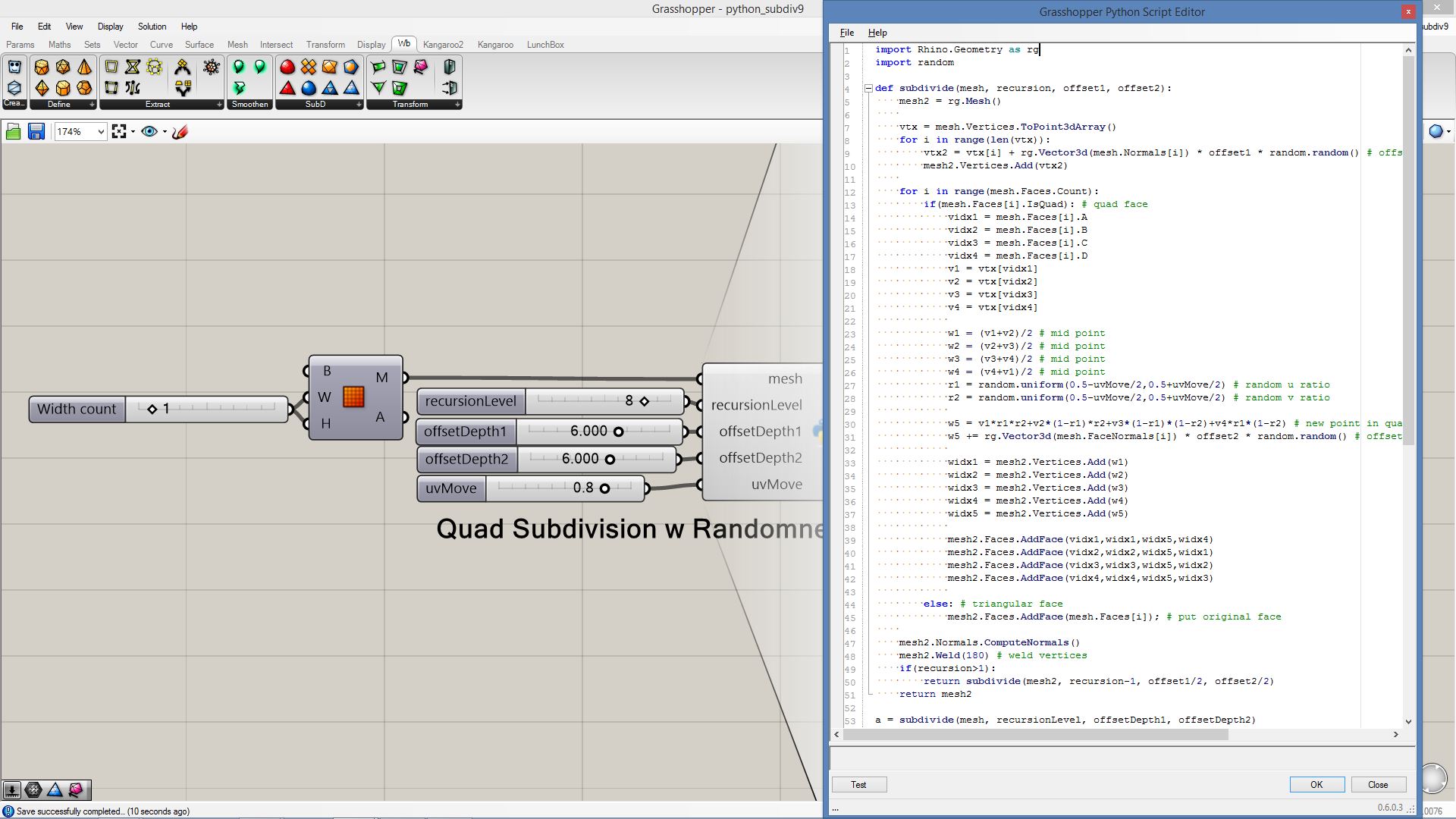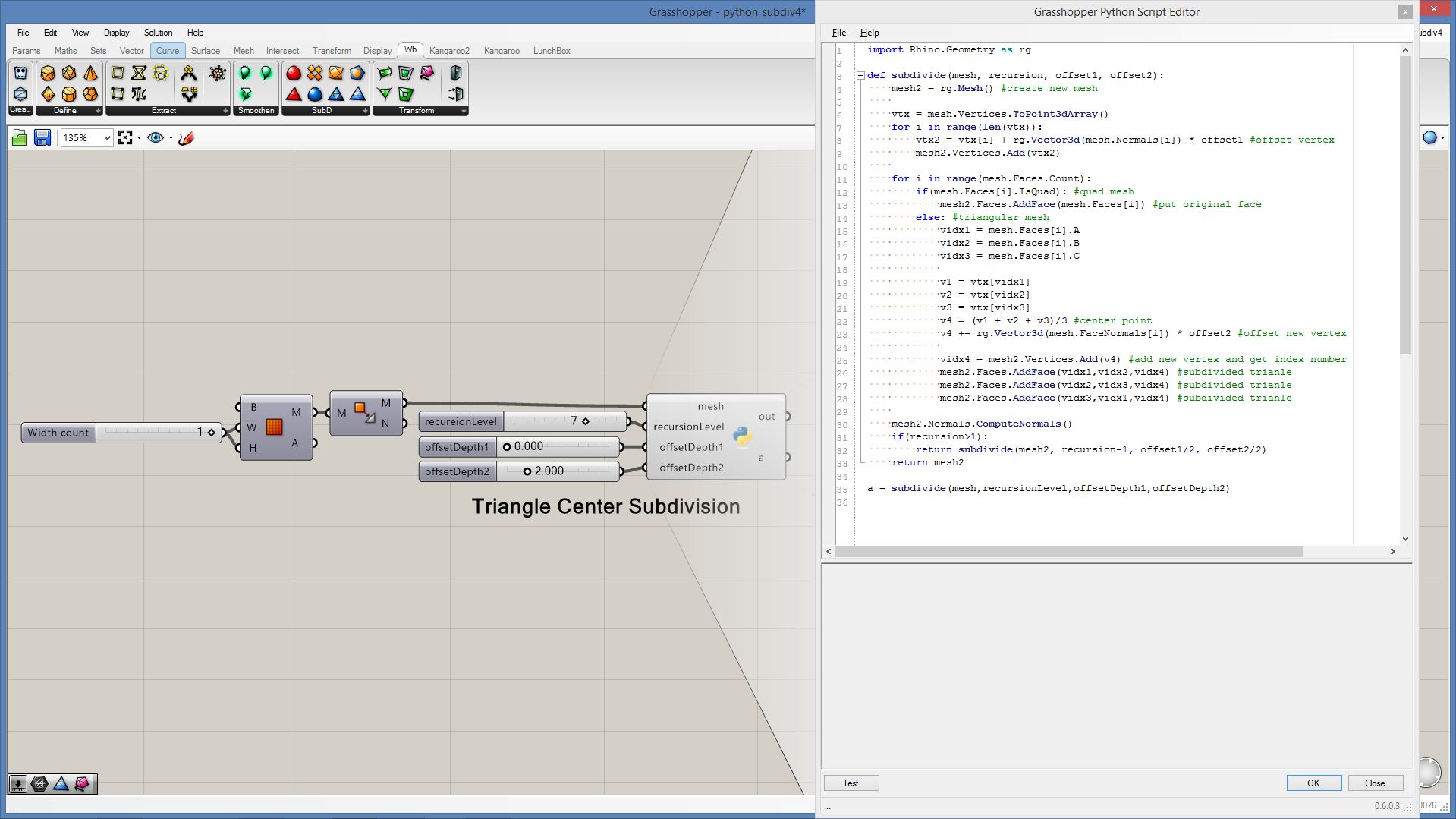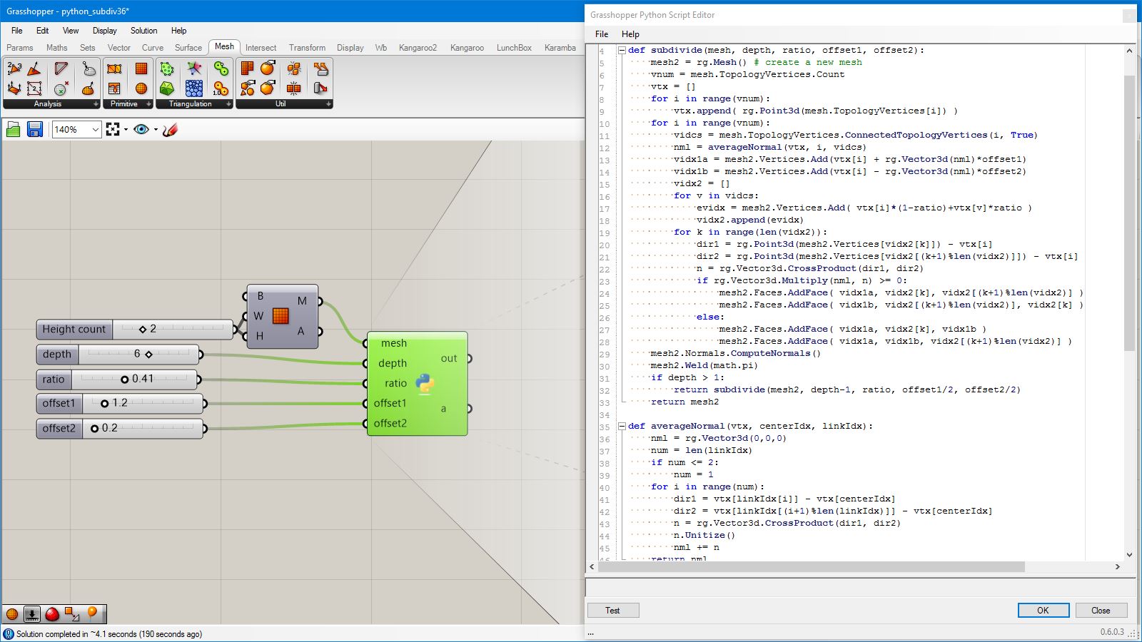 # this subdivided mesh faces by recursive function # input type - Mesh (Item Access) import rhinoscriptsyntax as rs import Rhino.Geometry as rg import random import math def subdivide(pt1, pt2, pt3, depth, resultList): if(depth == 0 or random.random()<0.1): # random omission v1 = rg.Point3f(pt1.X, pt1.Y, pt1.Z); v2 = rg.Point3f(pt2.X, pt2.Y, pt2.Z); v3 = rg.Point3f(pt3.X, pt3.Y, pt3.Z); resultList.append([v1,v2,v3]) else: npt1 = (pt1+pt2)/2 npt2 = (pt2+pt3)/2 npt3 = (pt3+pt1)/2 npt4 = (npt1+npt2+npt3)/3 normal = normalVector(pt1,pt2,pt3) npt4 += normal*0.06*math.sqrt(depth) subdivide(npt1, pt1, npt3, depth-1, resultList) subdivide(npt2, pt2, npt1, depth-1, resultList) subdivide(npt3, pt3, npt2, depth-1, resultList) subdivide(npt1, npt2, npt4, depth-1, resultList) subdivide(npt2, npt3, npt4, depth-1, resultList) subdivide(npt3, npt1, npt4, depth-1, resultList) def normalVector(pt1, pt2, pt3): vec1 = rg.Vector3d.Subtract(rg.Vector3d(pt2),rg.Vector3d(pt1)) vec2 = rg.Vector3d.Subtract(rg.Vector3d(pt3),rg.Vector3d(pt1)) return rg.Vector3d.CrossProduct(vec1, vec2) # main a = [] vertices = [] for face in mesh.Faces: pt1 = rg.Vector3d(mesh.Vertices[face.A]) pt2 = rg.Vector3d(mesh.Vertices[face.B]) pt3 = rg.Vector3d(mesh.Vertices[face.C]) subdivide(pt1, pt2, pt3, 5, vertices) if(face.IsQuad): pt4 = rg.Vector3d(mesh.Vertices[face.D]) subdivide(pt1, pt4, pt3, 5, vertices) # reverse order mesh2 = rg.Mesh() for vtx in vertices: idx = mesh2.Vertices.Count mesh2.Vertices.Add(vtx[0]) mesh2.Vertices.Add(vtx[1]) mesh2.Vertices.Add(vtx[2]) mesh2.Faces.AddFace(idx, idx+1, idx+2) a = mesh2