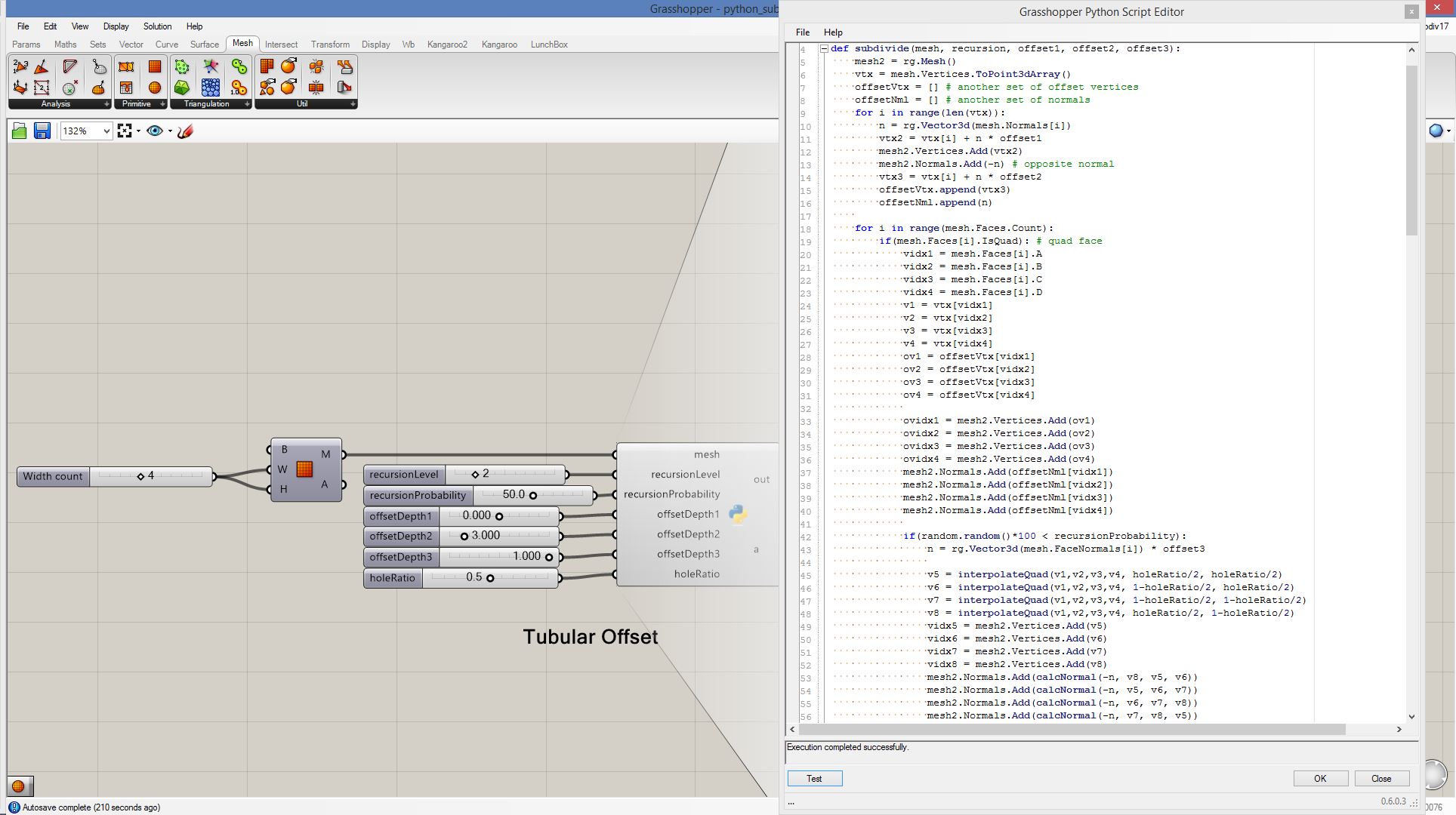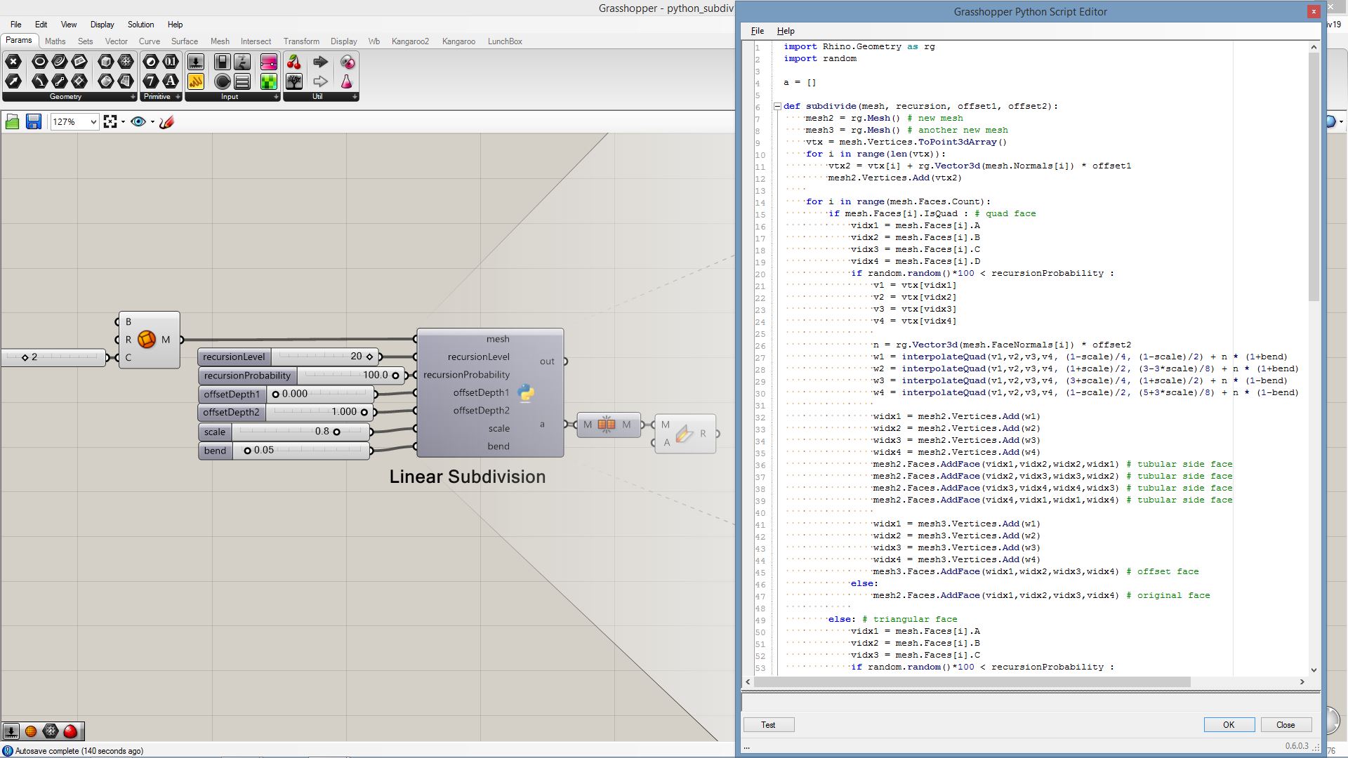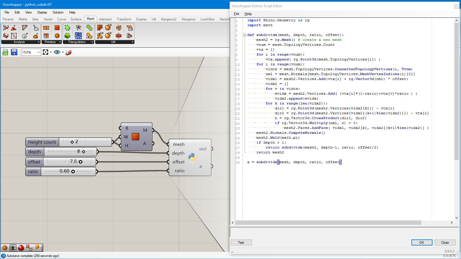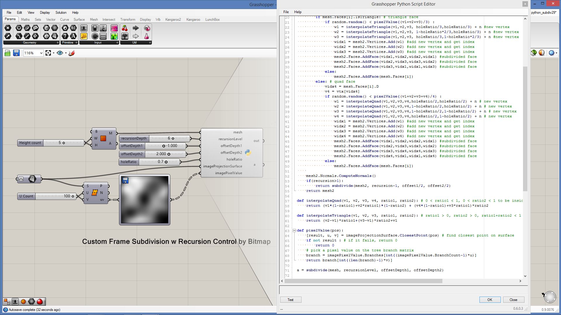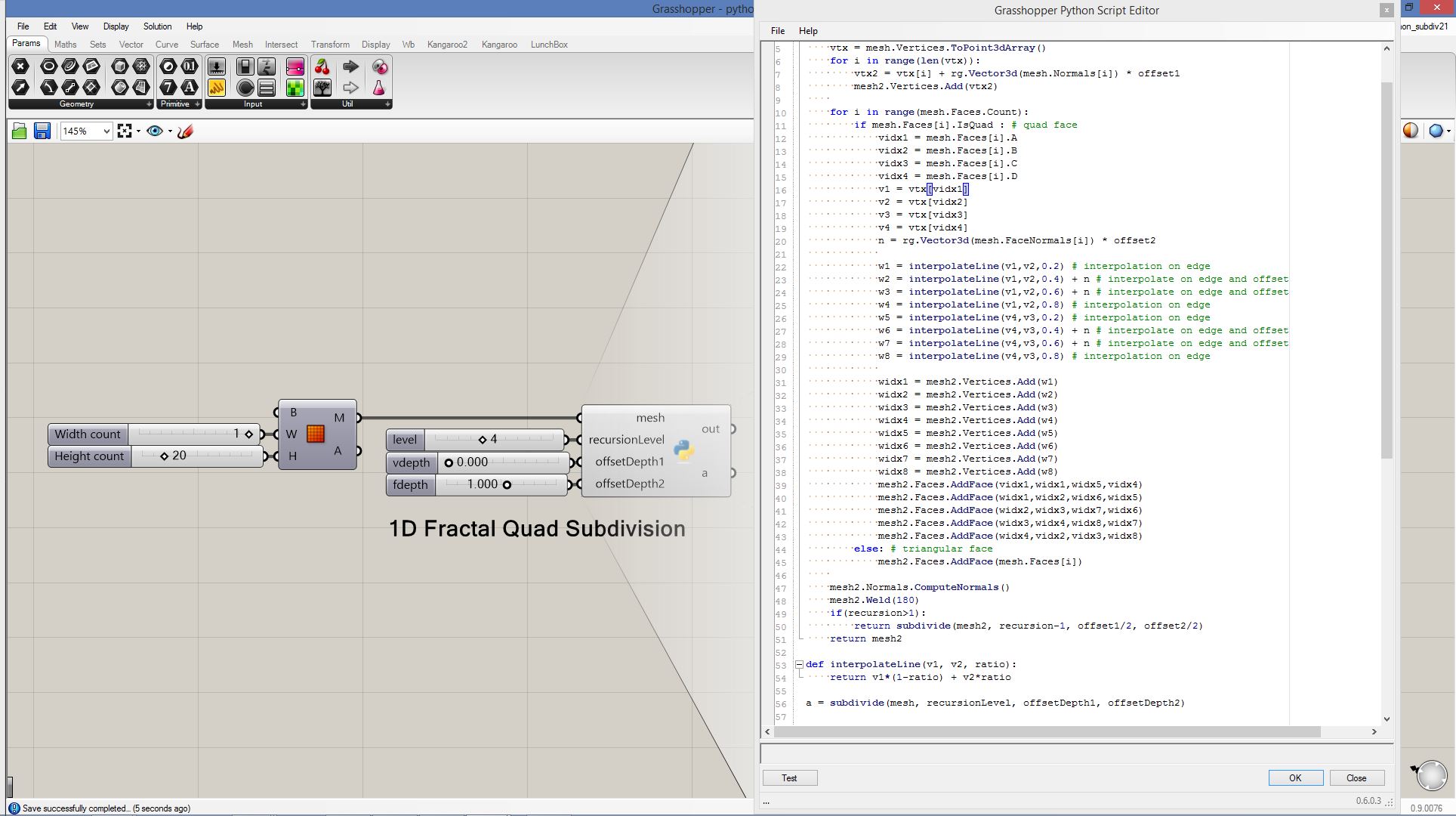 # this subdivided mesh faces by recursive function # input type - Mesh (Item Access) import rhinoscriptsyntax as rs import Rhino.Geometry as rg import random import math def subdivide(pt1, pt2, pt3, depth, resultList): if(depth == 0 or random.random()<0.1): # random omission v1 = rg.Point3f(pt1.X, pt1.Y, pt1.Z); v2 = rg.Point3f(pt2.X, pt2.Y, pt2.Z); v3 = rg.Point3f(pt3.X, pt3.Y, pt3.Z); resultList.append([v1,v2,v3]) else: npt1 = (pt1+pt2)/2 npt2 = (pt2+pt3)/2 npt3 = (pt3+pt1)/2 npt4 = (npt1+npt2+npt3)/3 normal = normalVector(pt1,pt2,pt3) npt4 += normal*0.06*math.sqrt(depth) subdivide(npt1, pt1, npt3, depth-1, resultList) subdivide(npt2, pt2, npt1, depth-1, resultList) subdivide(npt3, pt3, npt2, depth-1, resultList) subdivide(npt1, npt2, npt4, depth-1, resultList) subdivide(npt2, npt3, npt4, depth-1, resultList) subdivide(npt3, npt1, npt4, depth-1, resultList) def normalVector(pt1, pt2, pt3): vec1 = rg.Vector3d.Subtract(rg.Vector3d(pt2),rg.Vector3d(pt1)) vec2 = rg.Vector3d.Subtract(rg.Vector3d(pt3),rg.Vector3d(pt1)) return rg.Vector3d.CrossProduct(vec1, vec2) # main a = [] vertices = [] for face in mesh.Faces: pt1 = rg.Vector3d(mesh.Vertices[face.A]) pt2 = rg.Vector3d(mesh.Vertices[face.B]) pt3 = rg.Vector3d(mesh.Vertices[face.C]) subdivide(pt1, pt2, pt3, 5, vertices) if(face.IsQuad): pt4 = rg.Vector3d(mesh.Vertices[face.D]) subdivide(pt1, pt4, pt3, 5, vertices) # reverse order mesh2 = rg.Mesh() for vtx in vertices: idx = mesh2.Vertices.Count mesh2.Vertices.Add(vtx[0]) mesh2.Vertices.Add(vtx[1]) mesh2.Vertices.Add(vtx[2]) mesh2.Faces.AddFace(idx, idx+1, idx+2) a = mesh2