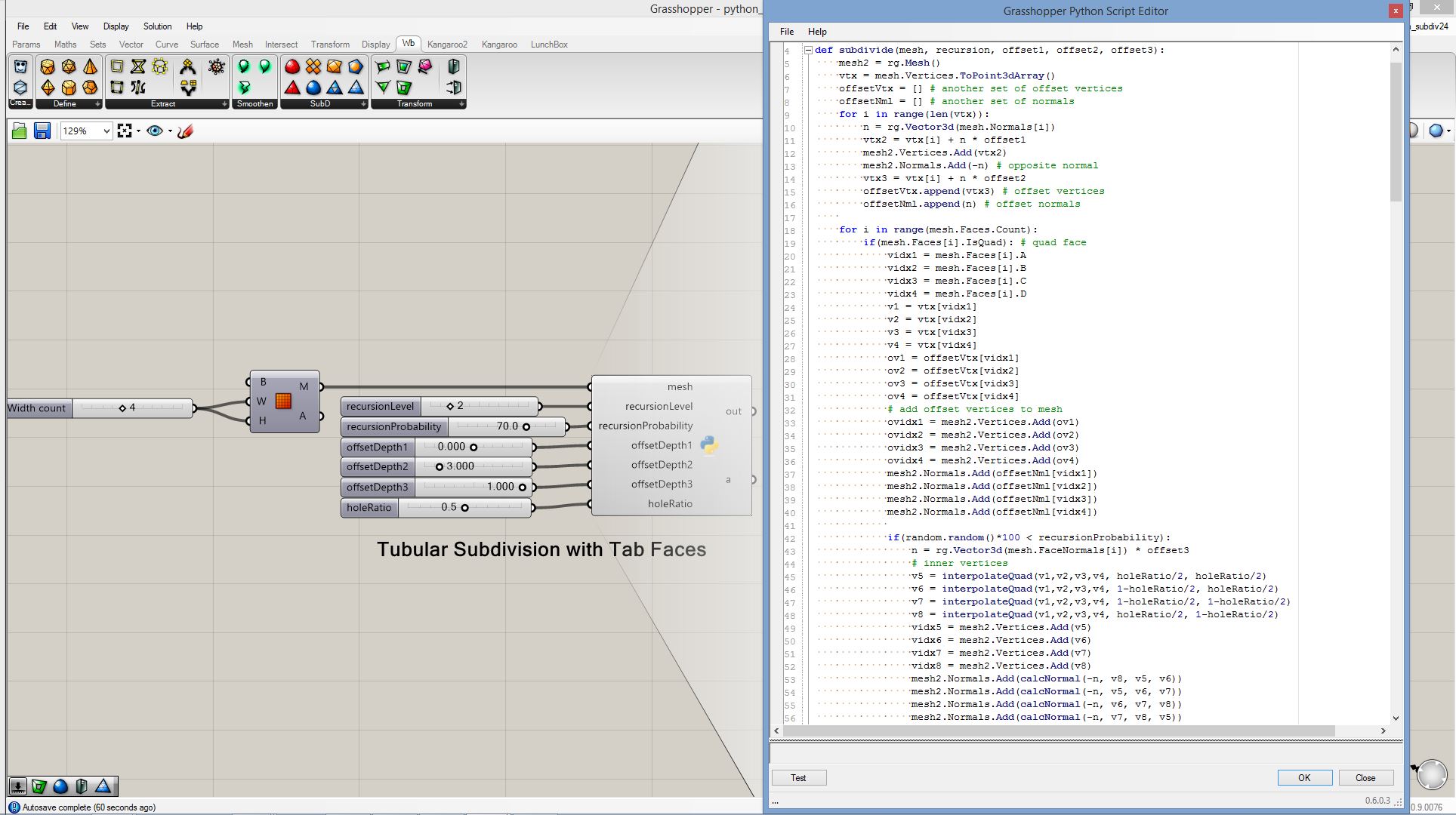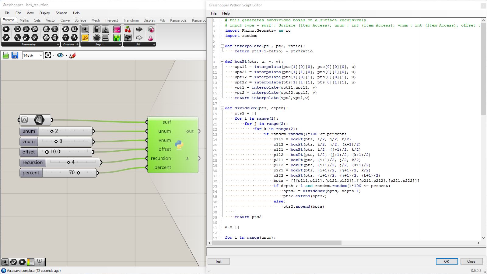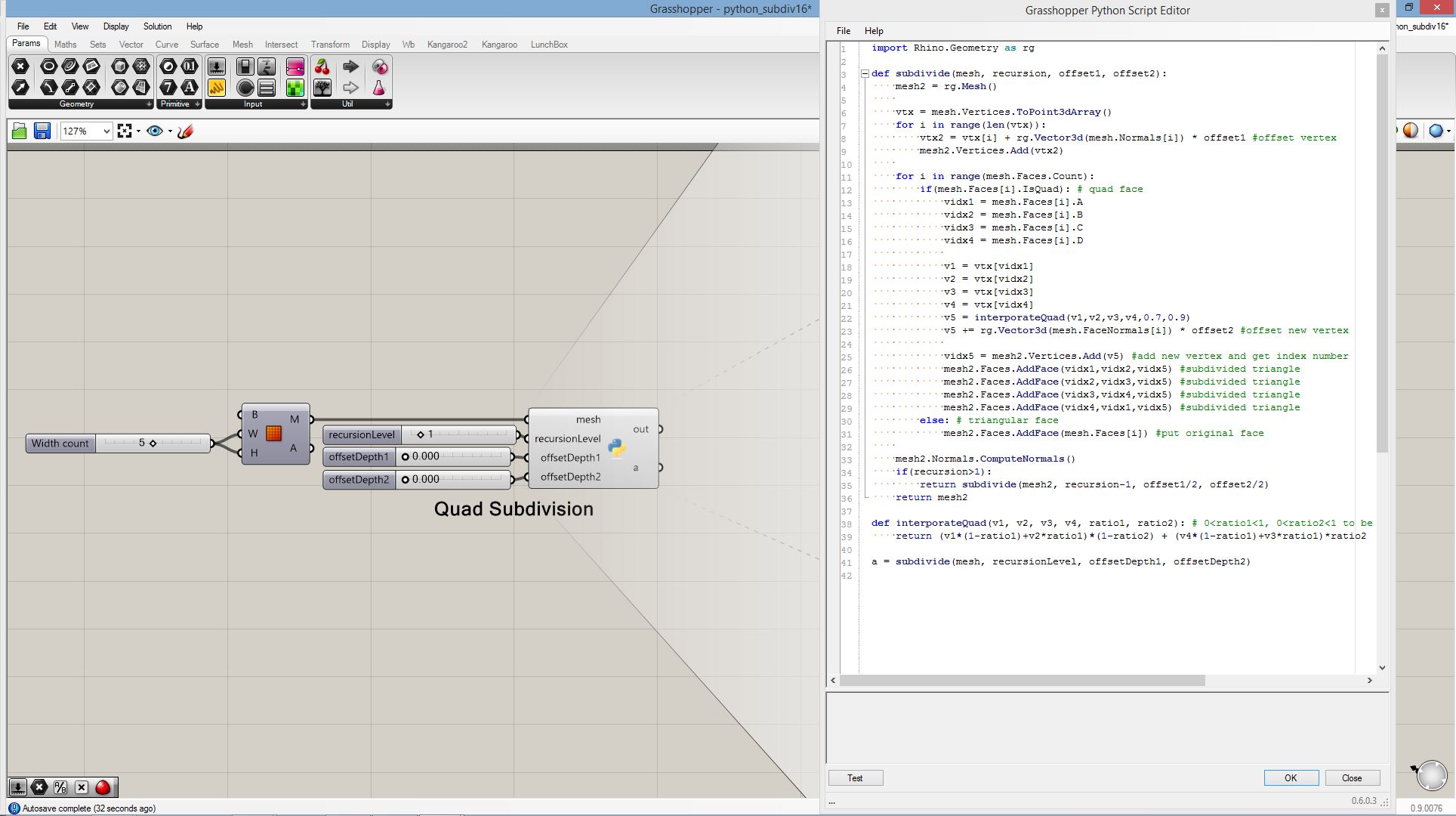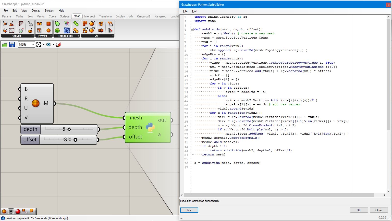 # this subdivided mesh faces by recursive function # input type - Mesh (Item Access) import rhinoscriptsyntax as rs import Rhino.Geometry as rg import random import math def subdivide(pt1, pt2, pt3, depth, resultList): if(depth == 0 or random.random()<0.1): # random omission v1 = rg.Point3f(pt1.X, pt1.Y, pt1.Z); v2 = rg.Point3f(pt2.X, pt2.Y, pt2.Z); v3 = rg.Point3f(pt3.X, pt3.Y, pt3.Z); resultList.append([v1,v2,v3]) else: npt1 = (pt1+pt2)/2 npt2 = (pt2+pt3)/2 npt3 = (pt3+pt1)/2 npt4 = (npt1+npt2+npt3)/3 normal = normalVector(pt1,pt2,pt3) npt4 += normal*0.06*math.sqrt(depth) subdivide(npt1, pt1, npt3, depth-1, resultList) subdivide(npt2, pt2, npt1, depth-1, resultList) subdivide(npt3, pt3, npt2, depth-1, resultList) subdivide(npt1, npt2, npt4, depth-1, resultList) subdivide(npt2, npt3, npt4, depth-1, resultList) subdivide(npt3, npt1, npt4, depth-1, resultList) def normalVector(pt1, pt2, pt3): vec1 = rg.Vector3d.Subtract(rg.Vector3d(pt2),rg.Vector3d(pt1)) vec2 = rg.Vector3d.Subtract(rg.Vector3d(pt3),rg.Vector3d(pt1)) return rg.Vector3d.CrossProduct(vec1, vec2) # main a = [] vertices = [] for face in mesh.Faces: pt1 = rg.Vector3d(mesh.Vertices[face.A]) pt2 = rg.Vector3d(mesh.Vertices[face.B]) pt3 = rg.Vector3d(mesh.Vertices[face.C]) subdivide(pt1, pt2, pt3, 5, vertices) if(face.IsQuad): pt4 = rg.Vector3d(mesh.Vertices[face.D]) subdivide(pt1, pt4, pt3, 5, vertices) # reverse order mesh2 = rg.Mesh() for vtx in vertices: idx = mesh2.Vertices.Count mesh2.Vertices.Add(vtx[0]) mesh2.Vertices.Add(vtx[1]) mesh2.Vertices.Add(vtx[2]) mesh2.Faces.AddFace(idx, idx+1, idx+2) a = mesh2
