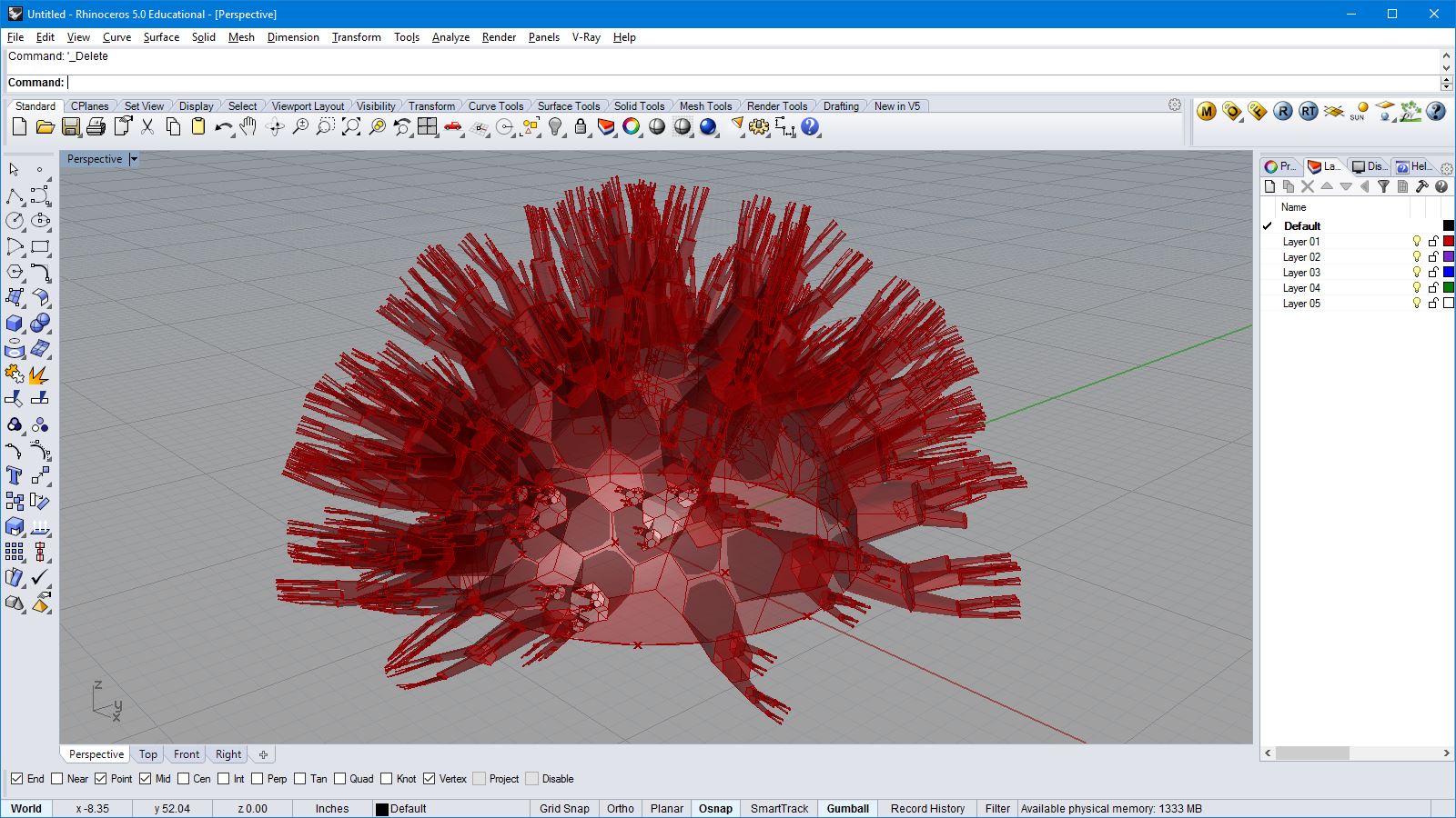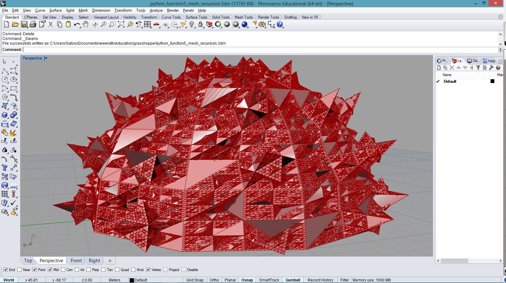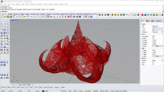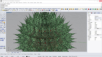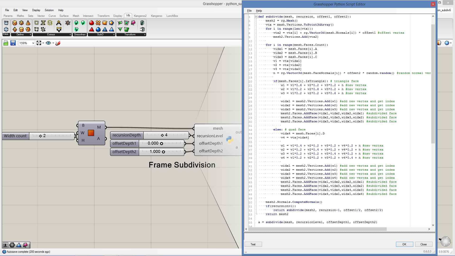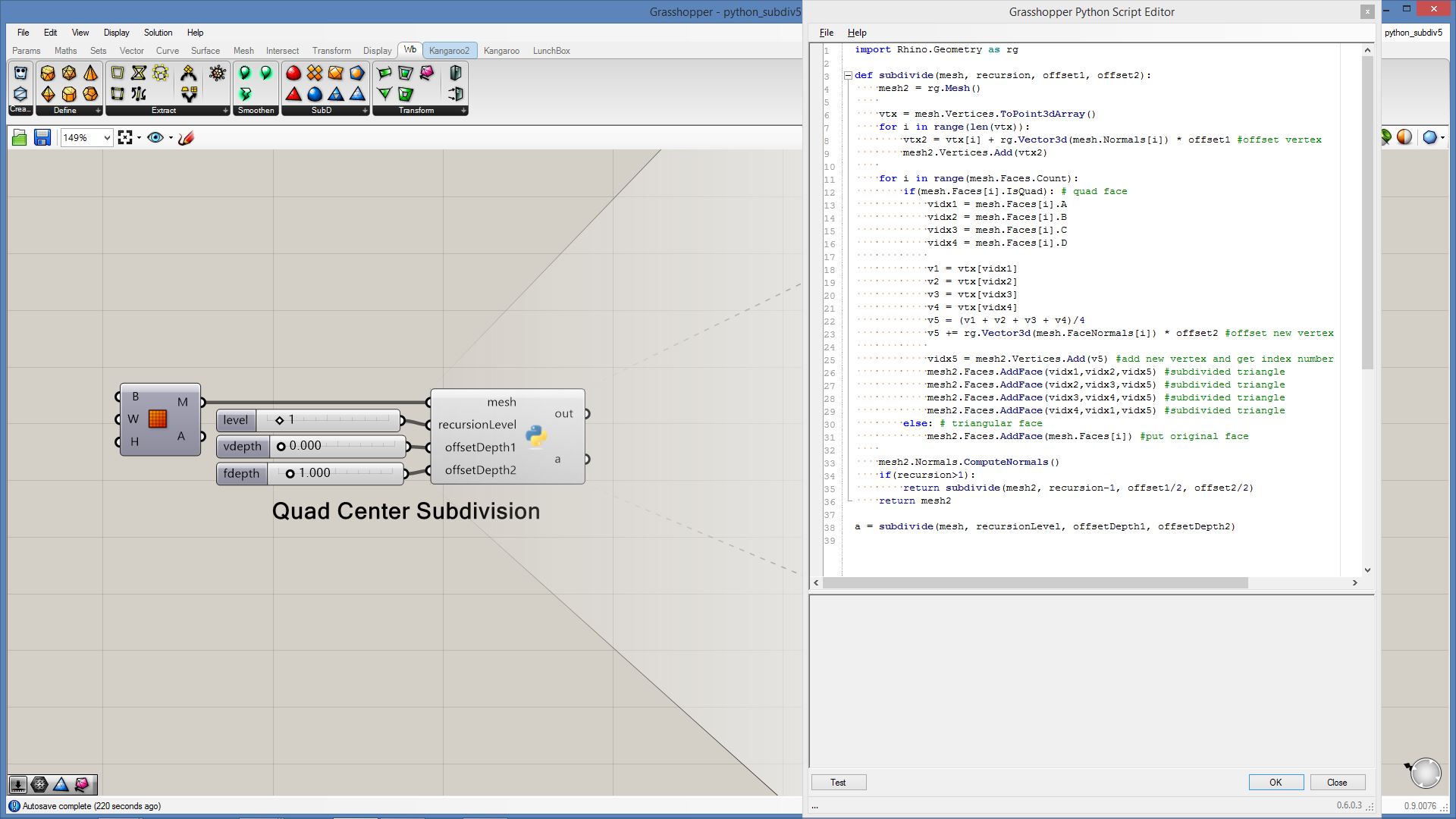 # this subdivided mesh faces by recursive function # input type - Mesh (Item Access) import rhinoscriptsyntax as rs import Rhino.Geometry as rg import random import math def subdivide(pt1, pt2, pt3, depth, resultList): if(depth == 0 or random.random()<0.1): # random omission v1 = rg.Point3f(pt1.X, pt1.Y, pt1.Z); v2 = rg.Point3f(pt2.X, pt2.Y, pt2.Z); v3 = rg.Point3f(pt3.X, pt3.Y, pt3.Z); resultList.append([v1,v2,v3]) else: npt1 = (pt1+pt2)/2 npt2 = (pt2+pt3)/2 npt3 = (pt3+pt1)/2 npt4 = (npt1+npt2+npt3)/3 normal = normalVector(pt1,pt2,pt3) npt4 += normal*0.06*math.sqrt(depth) subdivide(npt1, pt1, npt3, depth-1, resultList) subdivide(npt2, pt2, npt1, depth-1, resultList) subdivide(npt3, pt3, npt2, depth-1, resultList) subdivide(npt1, npt2, npt4, depth-1, resultList) subdivide(npt2, npt3, npt4, depth-1, resultList) subdivide(npt3, npt1, npt4, depth-1, resultList) def normalVector(pt1, pt2, pt3): vec1 = rg.Vector3d.Subtract(rg.Vector3d(pt2),rg.Vector3d(pt1)) vec2 = rg.Vector3d.Subtract(rg.Vector3d(pt3),rg.Vector3d(pt1)) return rg.Vector3d.CrossProduct(vec1, vec2) # main a = [] vertices = [] for face in mesh.Faces: pt1 = rg.Vector3d(mesh.Vertices[face.A]) pt2 = rg.Vector3d(mesh.Vertices[face.B]) pt3 = rg.Vector3d(mesh.Vertices[face.C]) subdivide(pt1, pt2, pt3, 5, vertices) if(face.IsQuad): pt4 = rg.Vector3d(mesh.Vertices[face.D]) subdivide(pt1, pt4, pt3, 5, vertices) # reverse order mesh2 = rg.Mesh() for vtx in vertices: idx = mesh2.Vertices.Count mesh2.Vertices.Add(vtx[0]) mesh2.Vertices.Add(vtx[1]) mesh2.Vertices.Add(vtx[2]) mesh2.Faces.AddFace(idx, idx+1, idx+2) a = mesh2