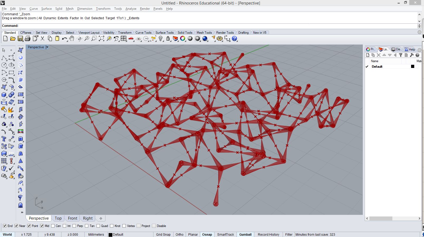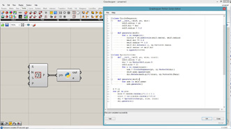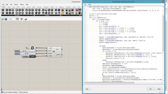 # defining a connective module # input type - pts : Point3d (List Access), threshold : float (Item Access), maxLink : int (Item Access), depthRatio : float (Item Access), shrinkRatio : float (Item Access) import Rhino.Geometry as rg import clr clr.AddReference("Grasshopper") from Grasshopper.Kernel.Data import GH_Path from Grasshopper import DataTree class Module1: def __init__(self, pt): self.pt = pt self.links = [] def connect(self, modules): #sort list by distance sorted(modules, key=lambda m: m.pt.DistanceTo(self.pt)) for m in modules: if len(self.links) >= maxLink: break if m is not self and m not in self.links: dist = m.pt.DistanceTo(self.pt) if dist < threshold and len(m.links) < maxLink: self.links.append(m) m.links.append(self) def generate(self): linkNum = len(self.links) if linkNum != 3: return # do nothing if less than 3 links self.armLength = 0 # total distance to links for m in self.links: self.armLength += m.pt.DistanceTo(self.pt) tricenter = (self.links[0].pt+self.links[1].pt+self.links[2].pt)/3 # center of triangle normal = rg.Vector3d.CrossProduct(self.links[1].pt-self.links[0].pt, self.links[2].pt-self.links[0].pt) # normal vector of triangle normal.Unitize() normal *= self.armLength * depthRatio # normal depth is changed by link distance for i in range(linkNum): spts = [] spts.append( (self.links[i].pt + self.pt)/2 ) # mid point sp = self.links[i].pt * 0.4 + self.pt * 0.6 # first radial point spts.append(sp) for j in range(30): # generating spiral points vec = sp - self.pt vec.Rotate(0.5, normal) sp = vec*shrinkRatio + self.pt + normal/30 spts.append(sp) spiralPts.AddRange(spts, GH_Path(self.id, i)) # using id number spiralPts = DataTree[rg.Point3d]() modules = [] for pt in pts: m = Module1(pt) m.id = len(modules) # setting id number modules.append(m) for m in modules: m.connect(modules) for m in modules: m.generate()