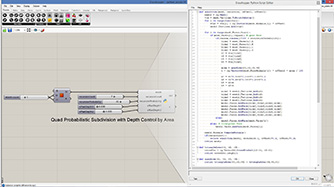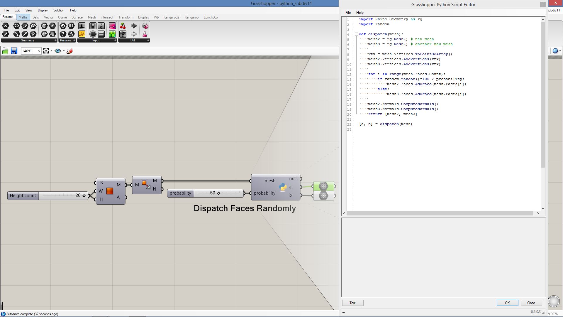 # move each vertex by the closest attractor and create a new mesh # input type - mesh : Mesh (Item Access), probability : float (Item Access) import Rhino.Geometry as rg import random def dispatch(mesh): mesh2 = rg.Mesh() # new mesh mesh3 = rg.Mesh() # another new mesh vtx = mesh.Vertices.ToPoint3dArray() mesh2.Vertices.AddVertices(vtx) # add all vertices mesh3.Vertices.AddVertices(vtx) # add all vertices for i in range(mesh.Faces.Count): if random.random()*100 < probability: # probabilistic switch with randomness mesh2.Faces.AddFace(mesh.Faces[i]) else: mesh3.Faces.AddFace(mesh.Faces[i]) mesh2.Normals.ComputeNormals() mesh3.Normals.ComputeNormals() return [mesh2, mesh3] returns two meshes [a, b] = dispatch(mesh)