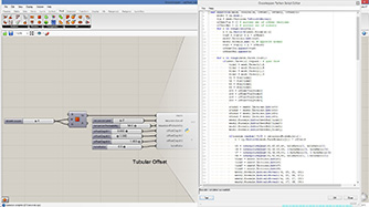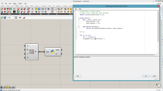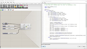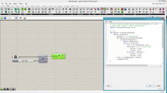 # defining a connective module # input type - pts : Point3d (List Access), threshold : float (Item Access), maxLink : int (Item Access) import Rhino.Geometry as rg # importing grasshopper tree classes import clr clr.AddReference("Grasshopper") from Grasshopper.Kernel.Data import GH_Path from Grasshopper import DataTree class Module1: def __init__(self, pt): self.pt = pt self.links = [] def connect(self, modules): sorted(modules, key=lambda m: m.pt.DistanceTo(self.pt)) for m in modules: if len(self.links) >= maxLink: break # finish loop if m is not self and m not in self.links: dist = m.pt.DistanceTo(self.pt) if dist < threshold and len(m.links) < maxLink: self.links.append(m) m.links.append(self) def generate(self): id = center.BranchCount center.Add(self.pt, GH_Path(id)) # add one data in a branch linkNum = len(self.links) armPts = [] for i in range(linkNum): pt2 = (self.pt + self.links[i].pt)/2 # mid point armPts.append(pt2) arm.AddRange(armPts, GH_Path(id)) # add multiple data in a branch # initialize output points in tree structure center = DataTree[rg.Point3d]() arm = DataTree[rg.Point3d]() modules = [] for pt in pts: m = Module1(pt) modules.append(m) for m in modules: m.connect(modules) for m in modules: m.generate()