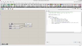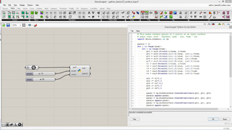 # This makes surface panels by 6 points on an input surface # input type: surf - Surface, unum - int, vnum - int, panelDepth - float import Rhino.Geometry as rg panels = [] for i in range(unum): for j in range(vnum): ratio = (i+j)%6 / 6 pt11 = surf.PointAt(i/unum, j/vnum) pt21 = surf.PointAt((i+1)/unum, j/vnum) pt12 = surf.PointAt(i/unum, (j+0.5)/vnum) pt22 = surf.PointAt((i+1+ratio)/unum, (j+0.5)/vnum) pt13 = surf.PointAt(i/unum, (j+1)/vnum) pt23 = surf.PointAt((i+1)/unum, (j+1)/vnum) n22 = surf.NormalAt((i+1)/unum, (j+0.5)/vnum) pt22 += n22* panelDepth * ratio panel = rg.NurbsSurface.CreateFromCorners(pt11,pt21,pt22,pt12) panels.append(panel) panel = rg.NurbsSurface.CreateFromCorners(pt12,pt22,pt23,pt13) panels.append(panel)